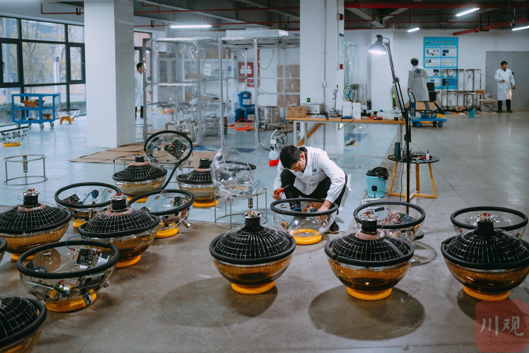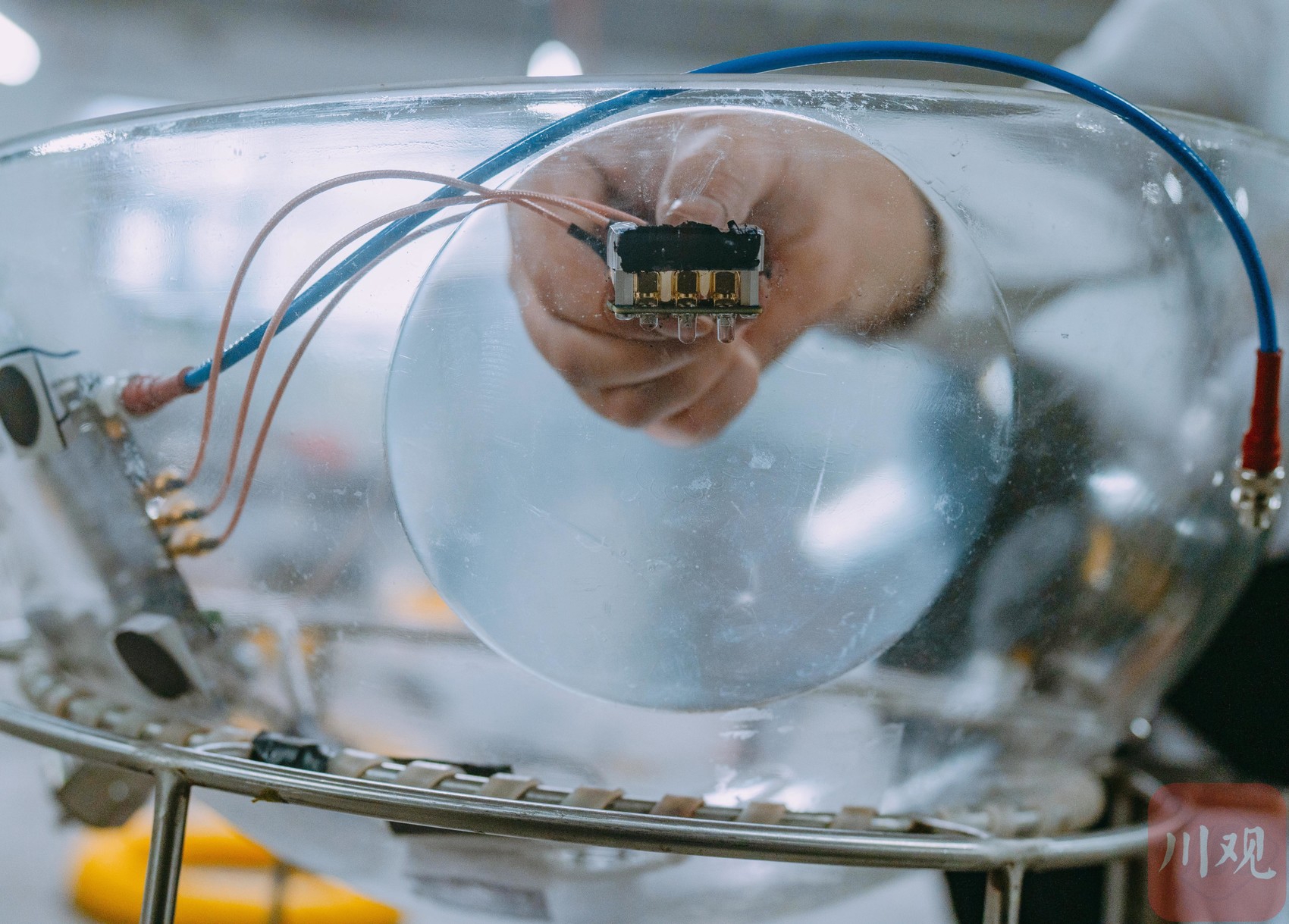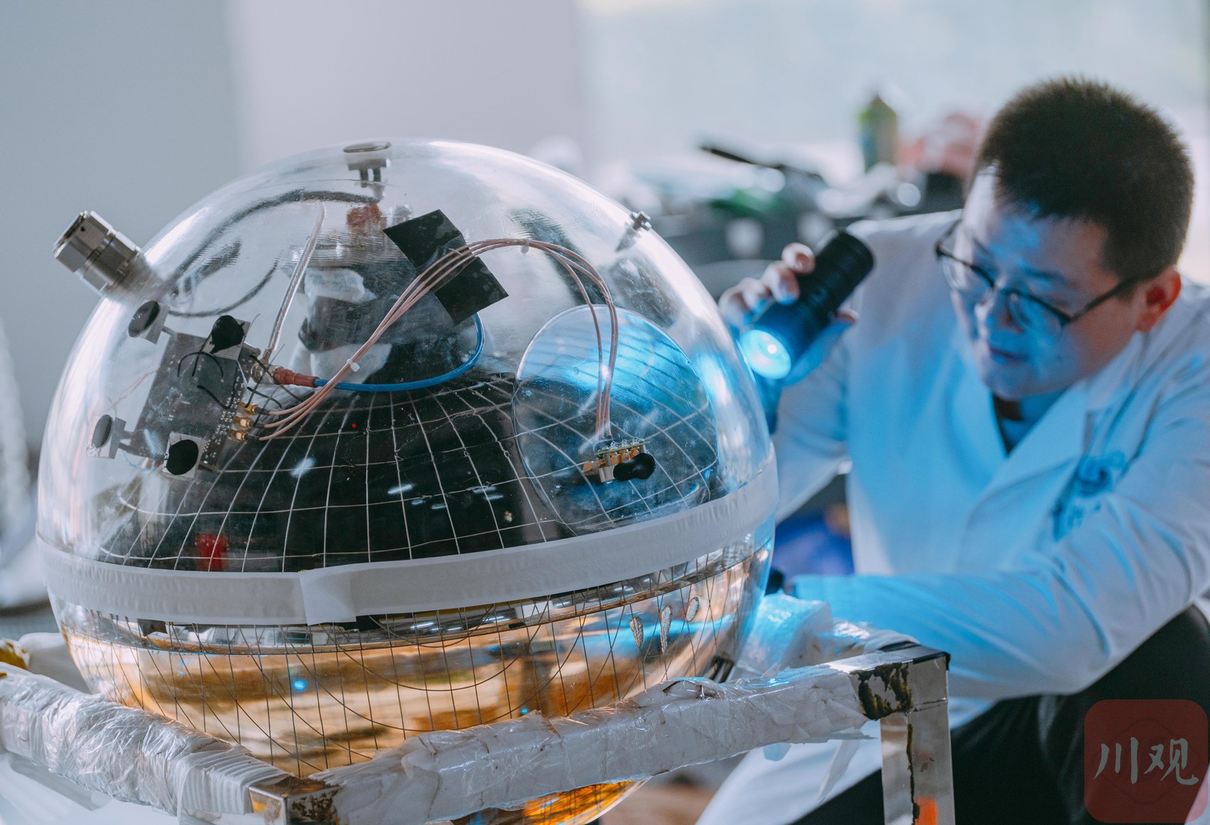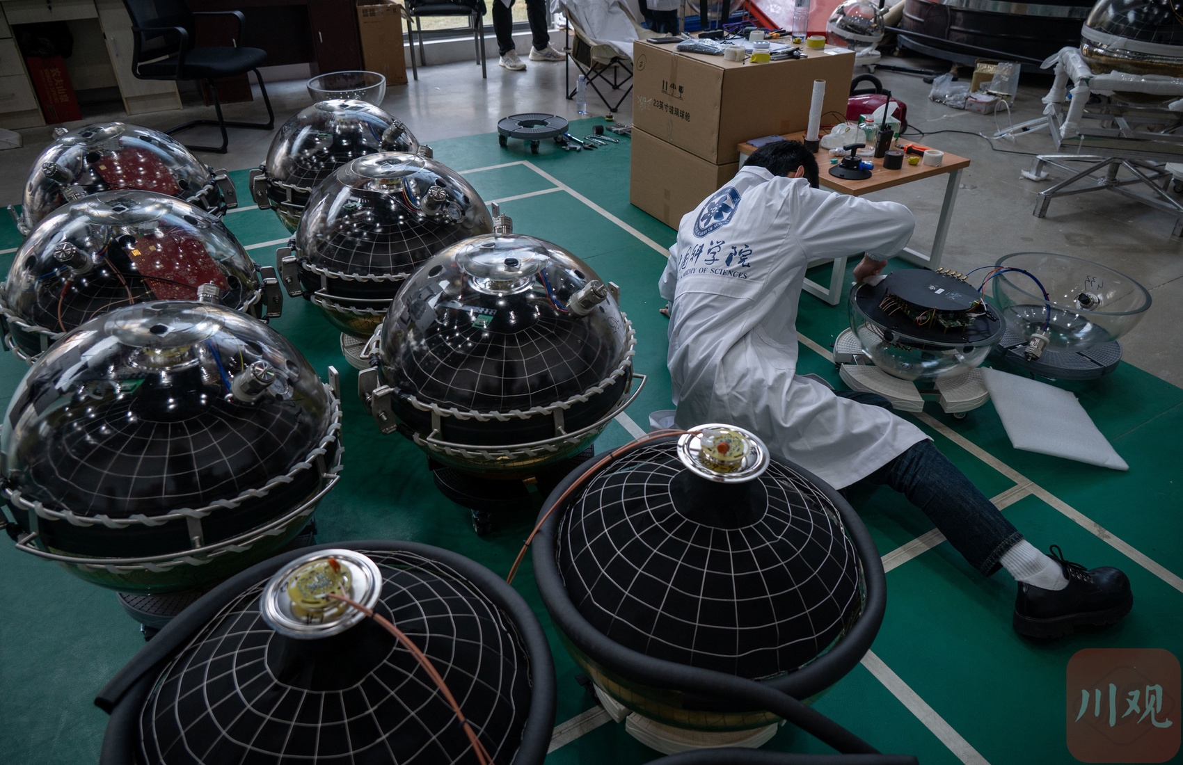 12月10日,四川天府宇宙线中心一楼的实验室内,科研人员正在对装有超大光敏探头的23英寸玻璃球舱进行组装与测试。这批精密探测器即将被投放到千米深的水下,用于捕捉宇宙线在水中产生的极其微弱的切伦科夫蓝光。