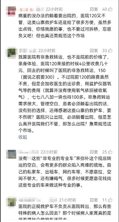 “病重的患者要躺着出院的,专用救护车又无法提供服务,此时这类‘山寨救护车’给了很多方便。”
