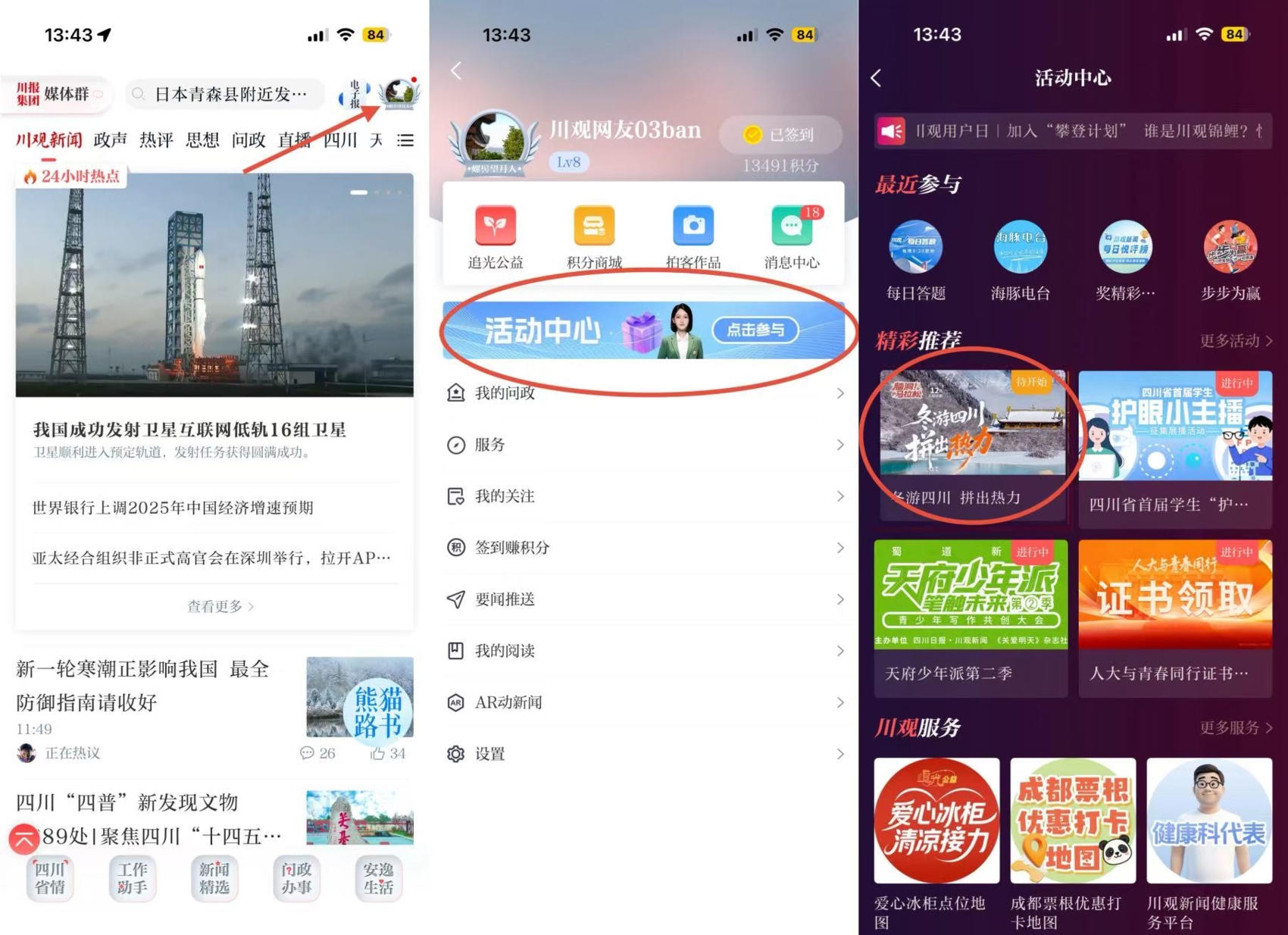 方式三:在川观新闻首页,点击右上角“我的”,再点击“活动中心”,找到“冬游四川 拼出热力”活动图片,点击即可参与;