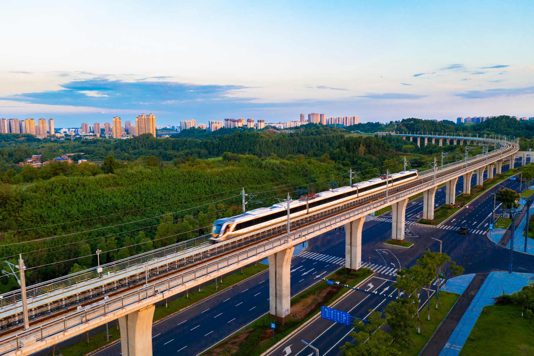 行进中的轨道交通资阳线穿过资阳临空经济区(吴昊江摄)