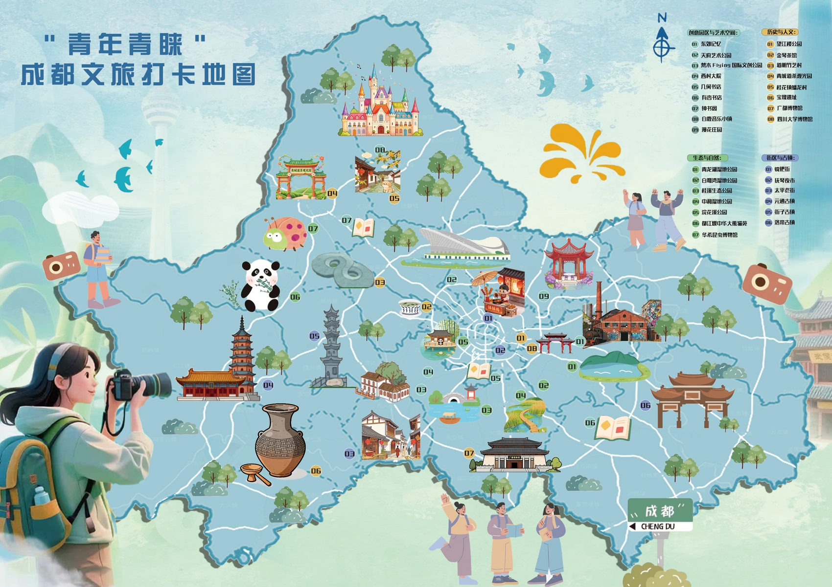 12月15日,记者从共青团成都市委获悉,“青年青睐”成都文旅打卡地图正式发布。地图涵盖创意园区与艺术空间、历史与人文、生态与自然、街区与古镇4个类别的31个代表性场景,为青年提供了出行指南。