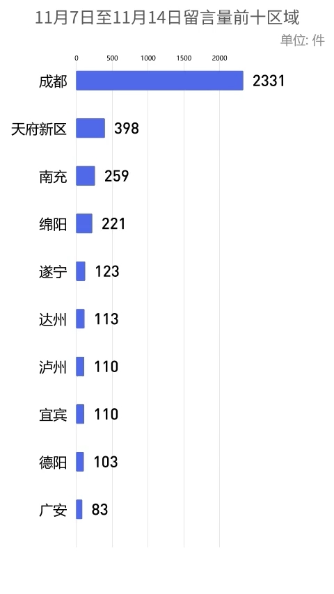 各市州及天府新区的留言量分别为:成都2331件、天府新区398件、南充259件、绵阳221件、遂宁123件、达州113件、泸州110件、宜宾110件、德阳103件、广安83件、眉山80件、乐山62件、自贡62件、广元61件、凉山57件、内江57件、巴中57件、资阳47件、阿坝42件、攀枝花32件、雅安28件、甘孜16件。
