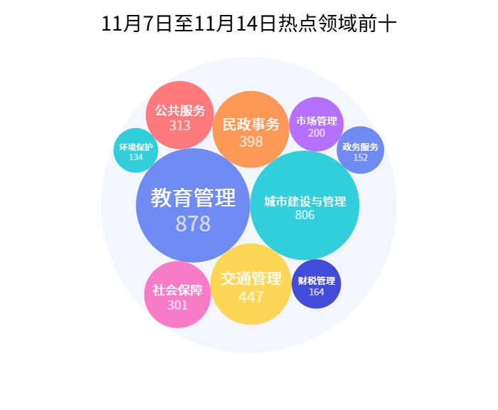 网民留言领域前十分别为教育管理878件、城市建设与管理806件、交通管理447件、民政事务398件、公共服务313件、社会保障301件、市场管理200件、财税管理164件、政务服务152件、环境保护134件。