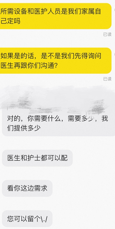 部分服务商无法出具医疗牌照、医护人员执业证明,转运所需医疗人员数量和医护设备种类均要求患者及家属自行安排。网络截图