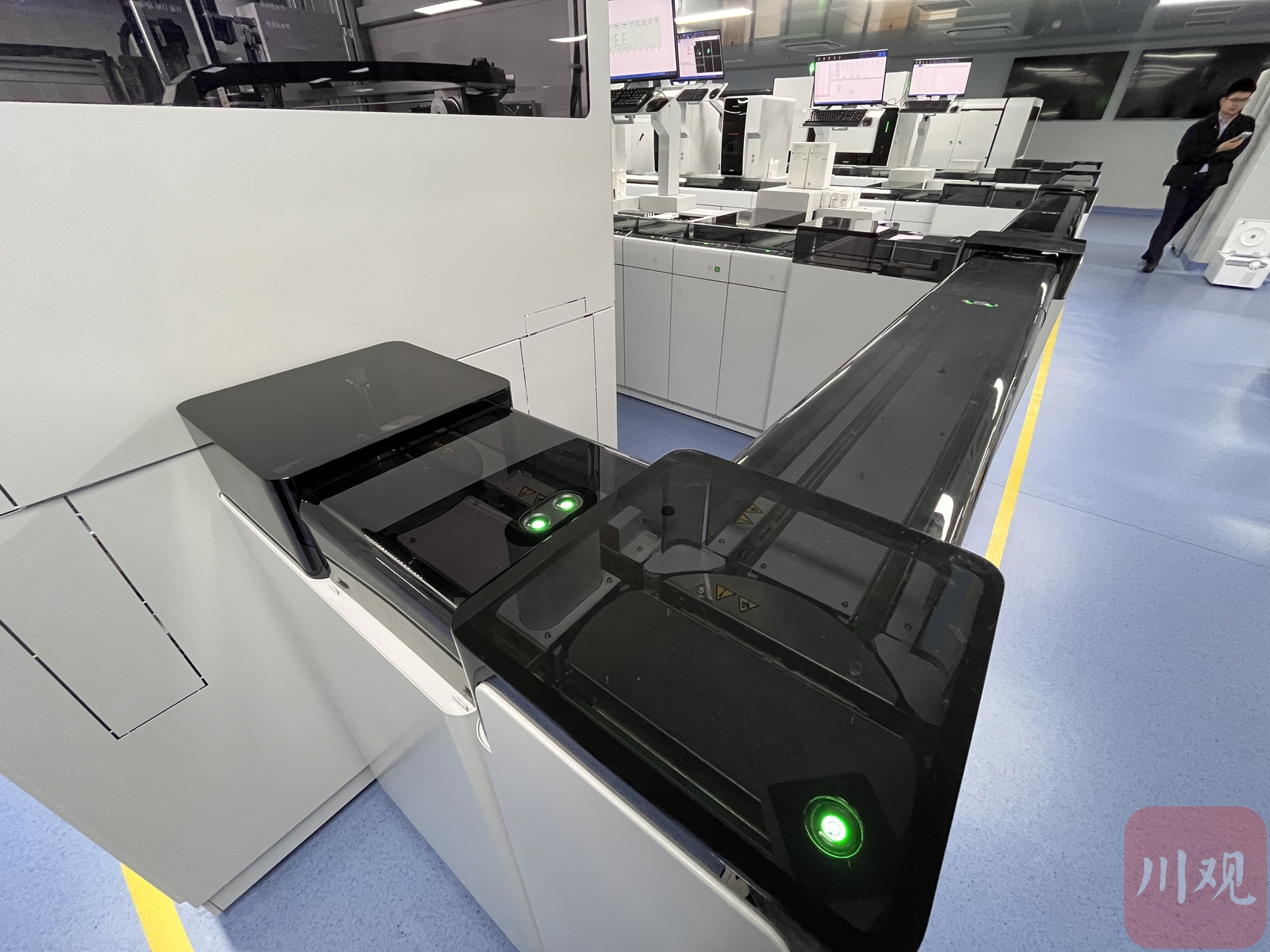 检验科内的多条传送带可将废弃标本送至回收机器。