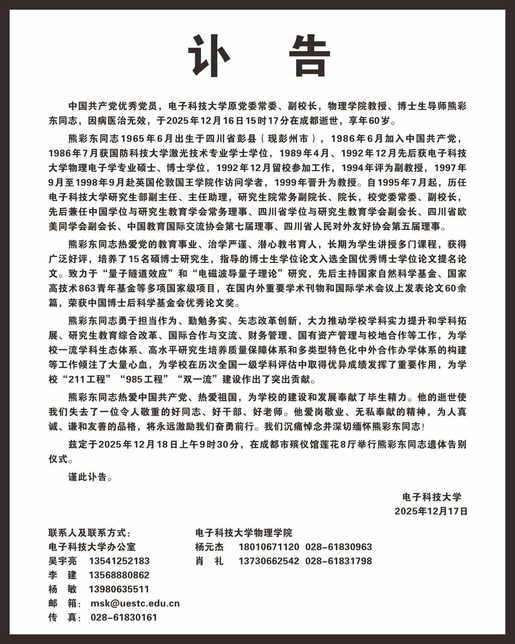 12月17日,电子科技大学物理学院官网发布讣告,电子科技大学原党委常委、副校长,物理学院教授、博士生导师熊彩东同志,因病医治无效,于2025年12月16日15时17分在成都逝世,享年60岁。