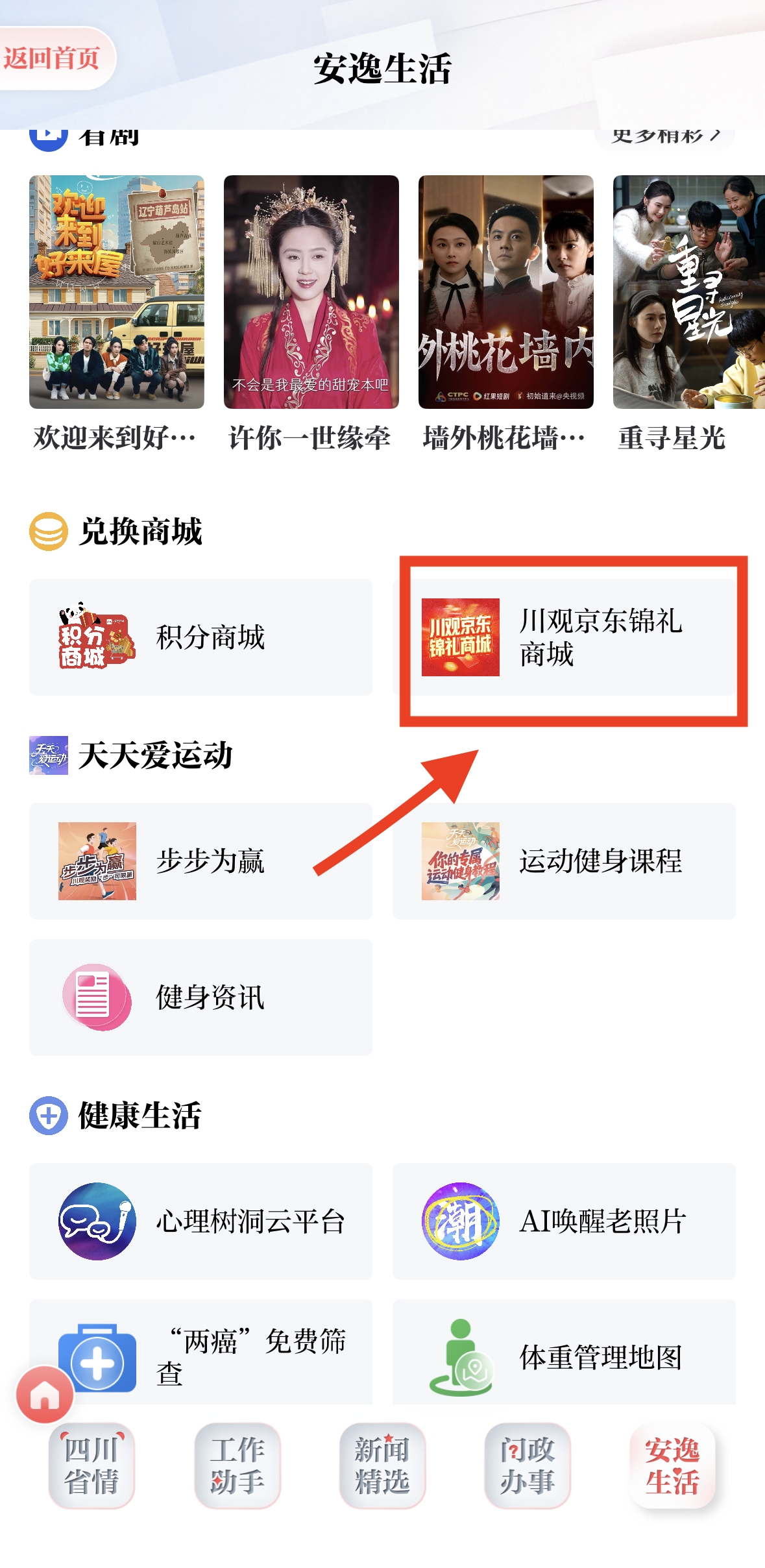 方式二:打开川观新闻,点击底部“安逸生活”栏目,找到“川观京东锦礼商城”图标,进入商城开启兑换;