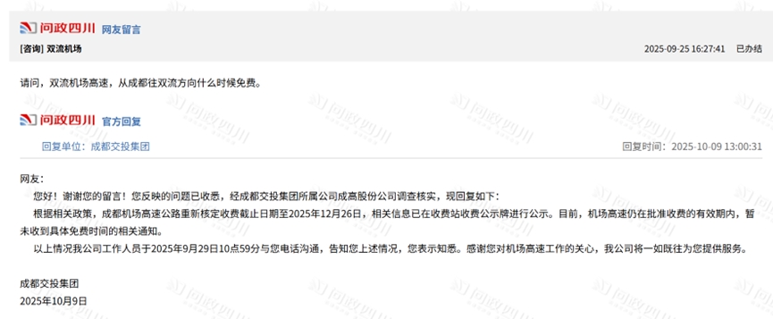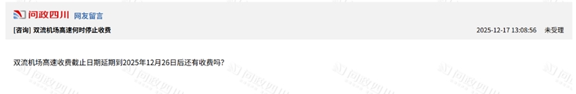 近日,有网友在问政四川平台上发帖询问,“双流机场高速收费截止日期延期到2025年12月26日后还有收费吗?”