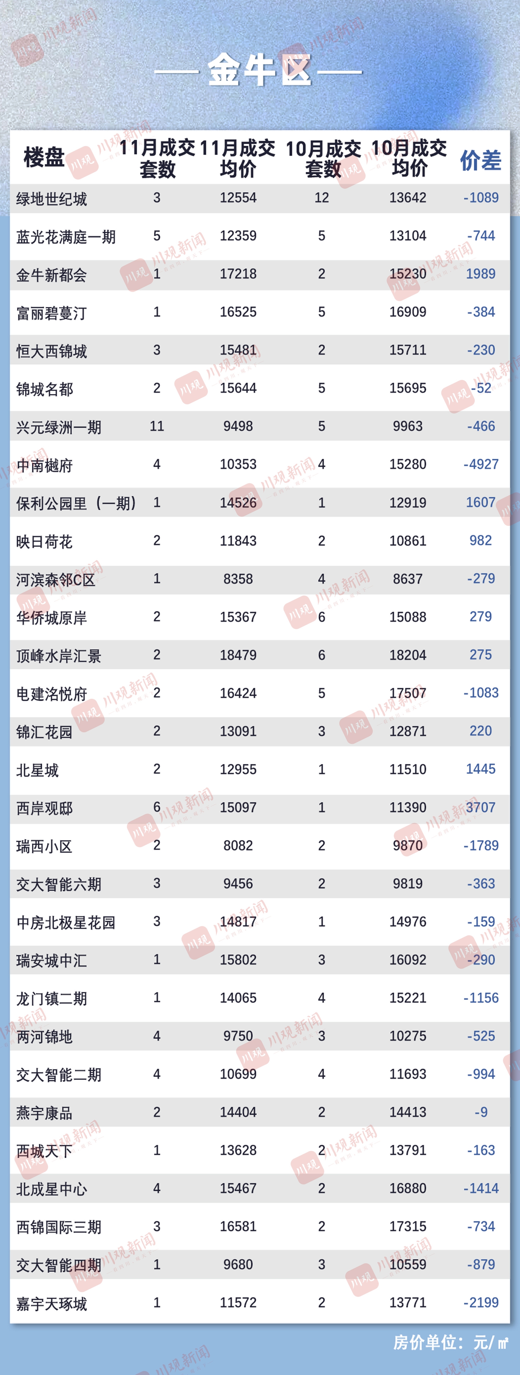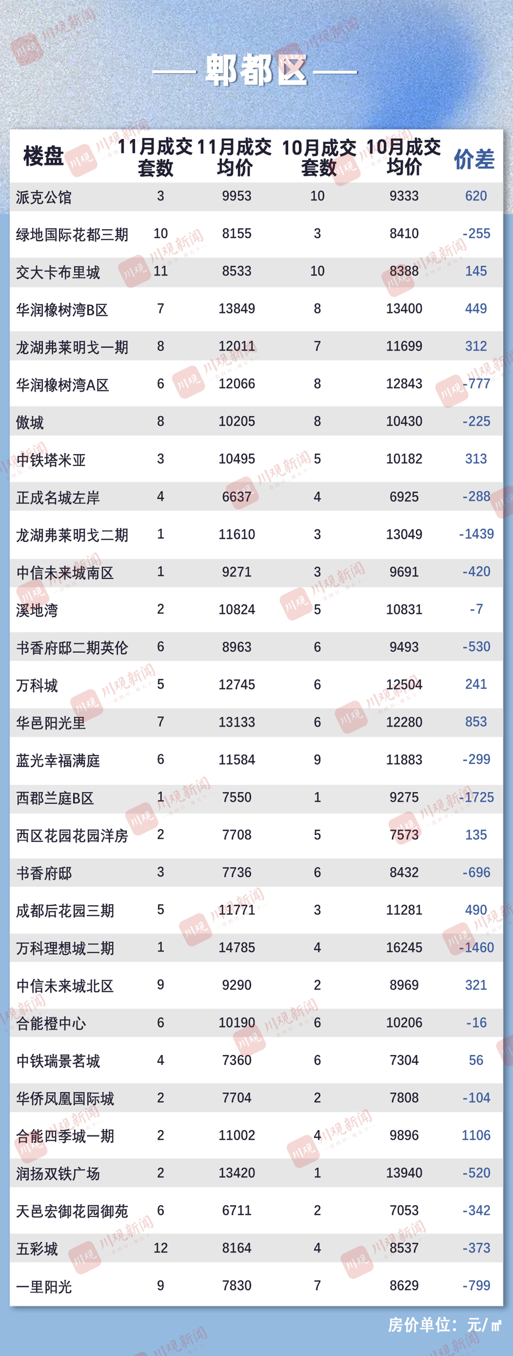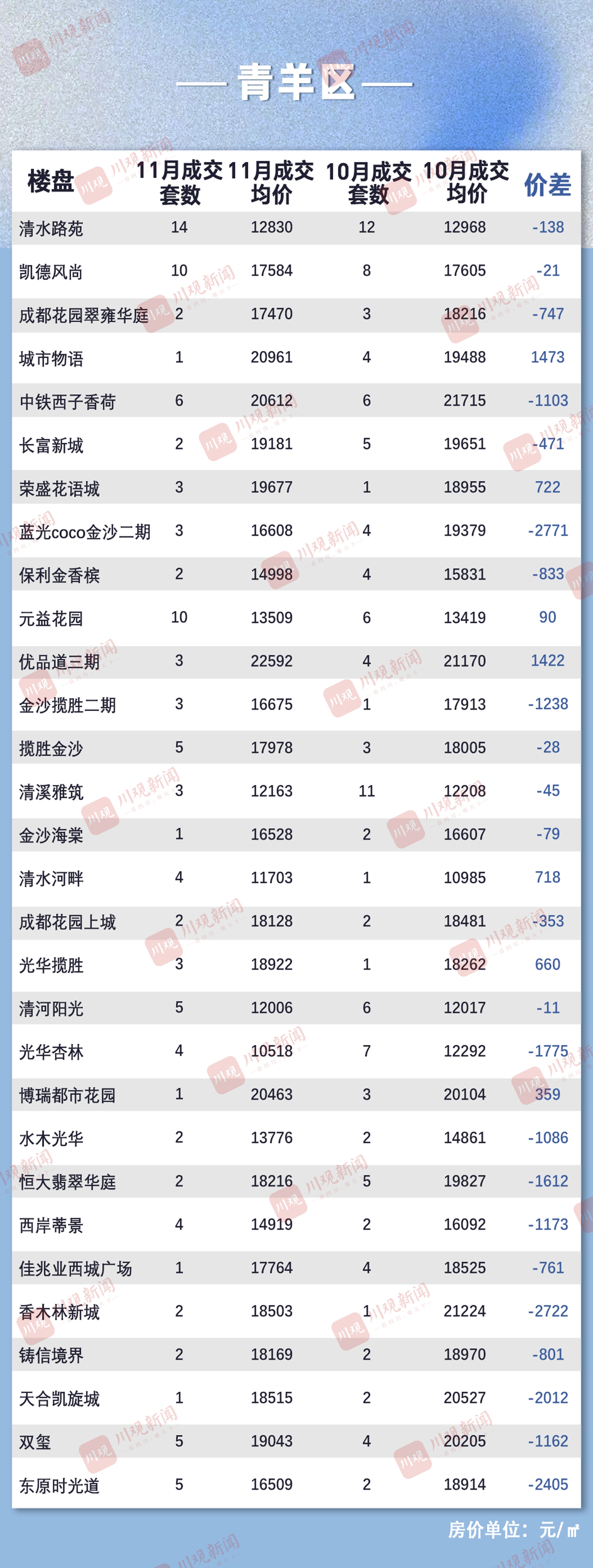 川观新闻联合成都业内知名平台“都成新楼市”微信公众号,按月推出成都二手房真实成交价格大全,统计范围为除青白江区、新津区以外的成都中心城区(包含高新西区),每个区热门度前60的楼盘。上月自家片区、热门楼盘的成交均价、近期成交明细、价格走势……所有数据直观呈现,一目了然。