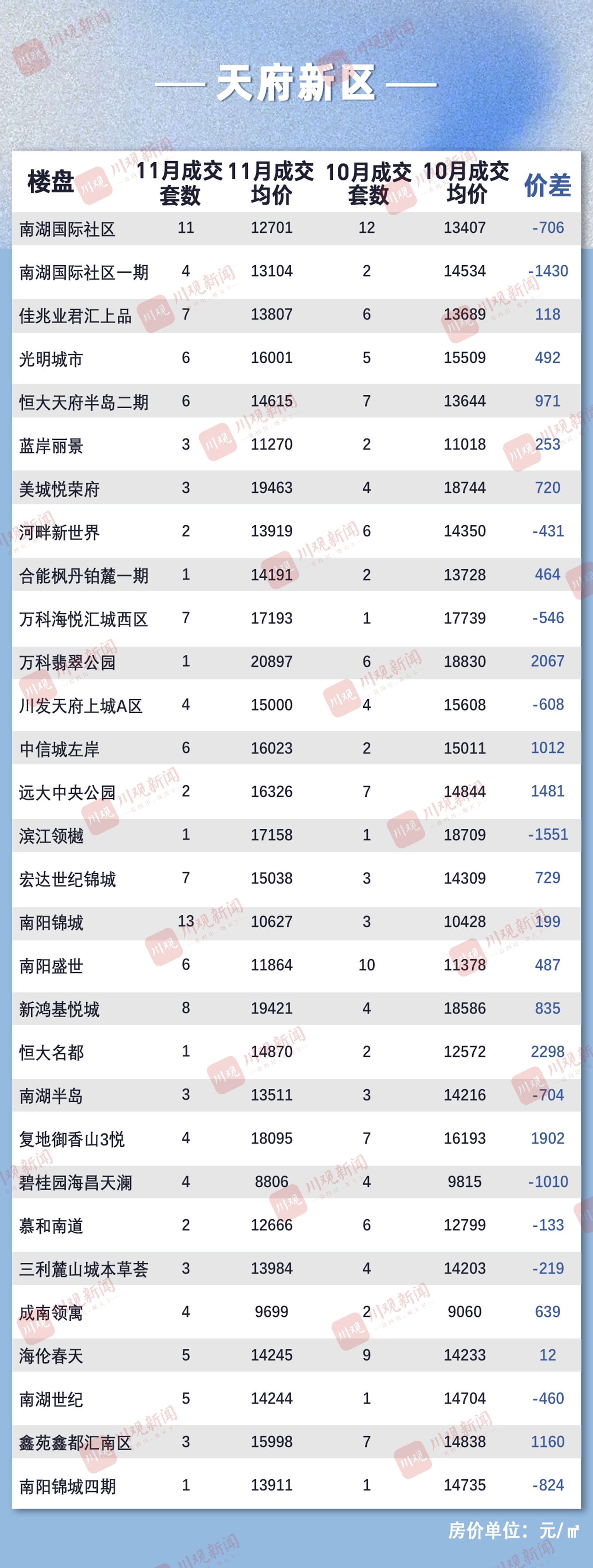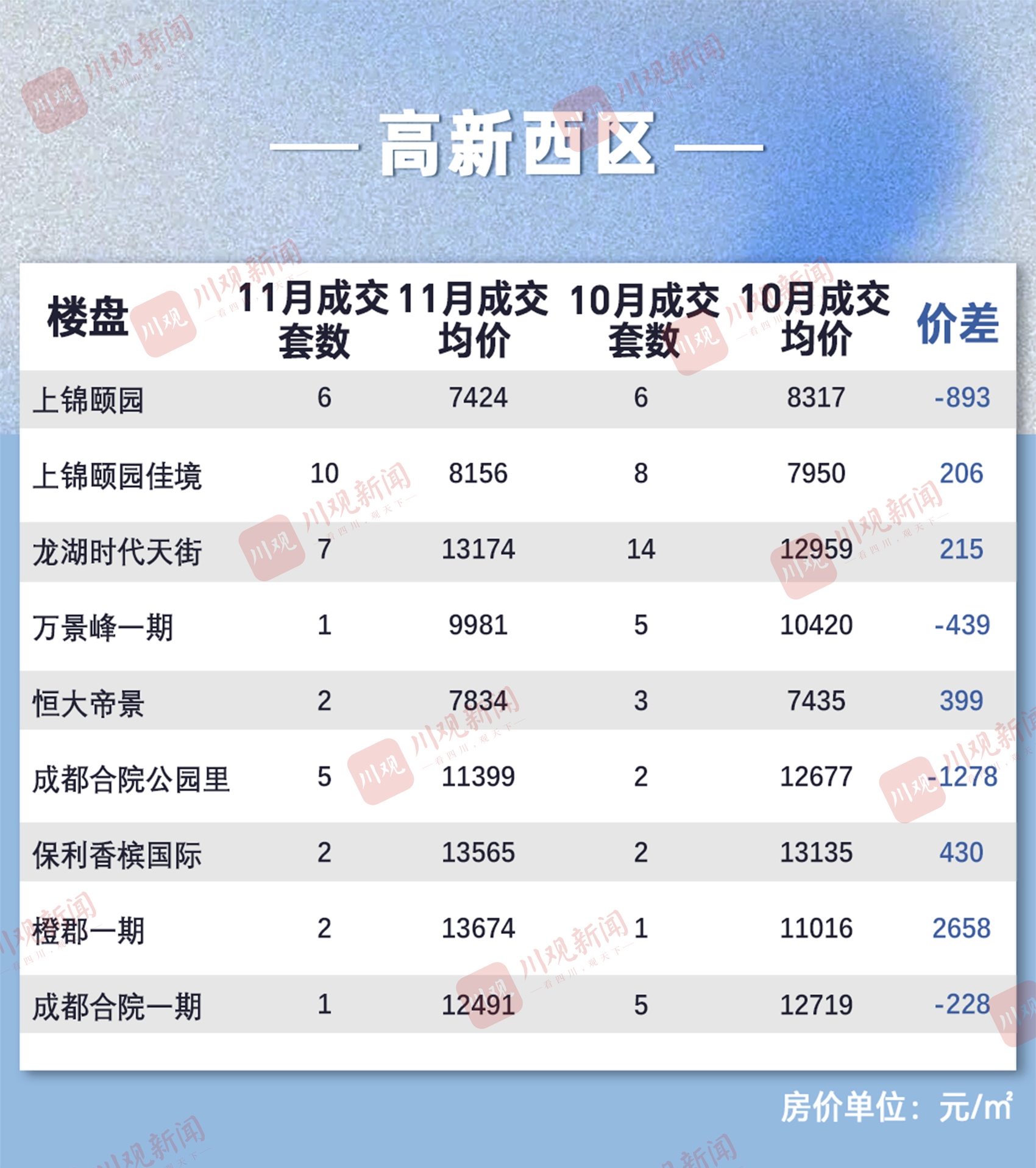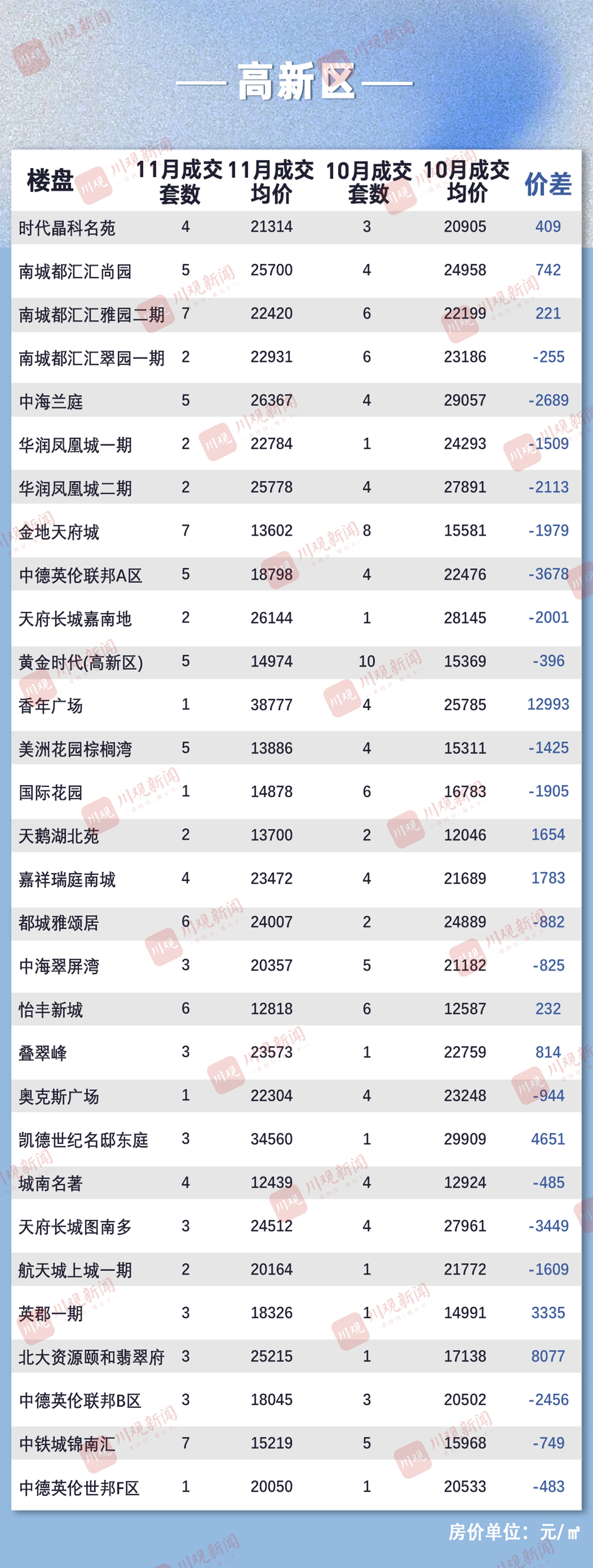 川观新闻联合成都业内知名平台“都成新楼市”微信公众号,按月推出成都二手房真实成交价格大全,统计范围为除青白江区、新津区以外的成都中心城区(包含高新西区),每个区热门度前60的楼盘。上月自家片区、热门楼盘的成交均价、近期成交明细、价格走势……所有数据直观呈现,一目了然。
