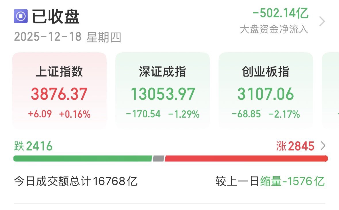 12月18日,A股三大指数涨跌不一。截至收盘,沪指涨0.16%,收报3876.37点;深成指跌1.29%,收报13053.97点;创业板指跌2.17%,收报3107.06点。全市场成交额16768亿元,较昨日缩量1576亿元。从个股涨幅来看,可谓是“几家欢喜几家愁”——2800余只个股上涨,2400余只个股下跌。