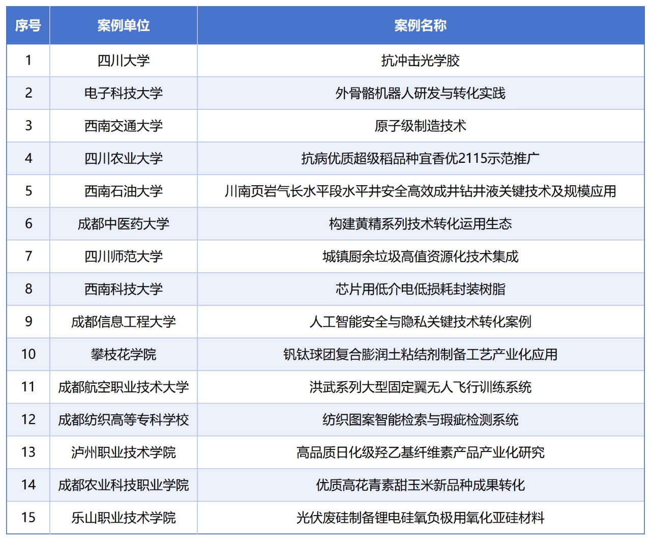 四川在线记者12月18日从省教育厅获悉,为进一步推动我省高校科技成果转移转化,发挥典型示范引领作用,经高校申报、专家评审网上公示、省教育厅审定等程序,我省遴选出“四川省高校科技成果转化典型案例”15个,具体见下表。