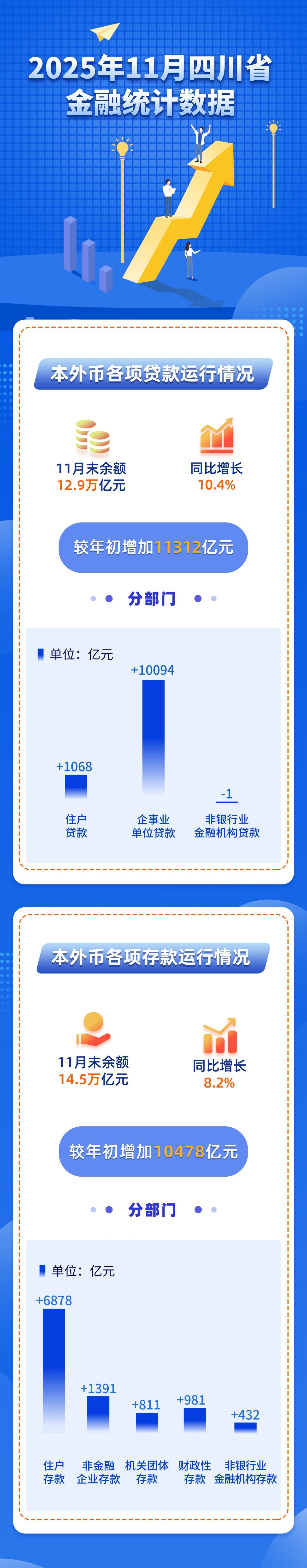 12月18日,中国人民银行四川省分行发布四川省金融最新统计数据:2025年11月末,本外币各项贷款余额12.9万亿元,同比增长10.4%,较年初增加11312亿元。分部门看,住户贷款增加1068亿元,企事业单位贷款增加10094亿元,非银行业金融机构贷款减少1亿元。