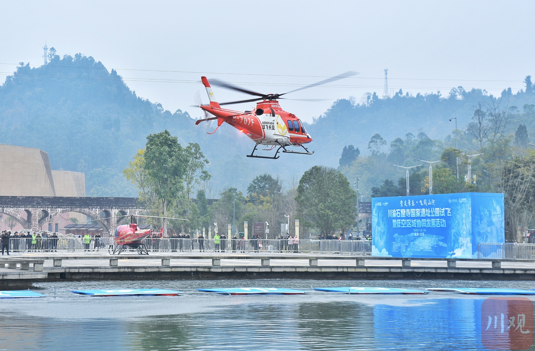 直升机从大足石刻游客中心起飞。