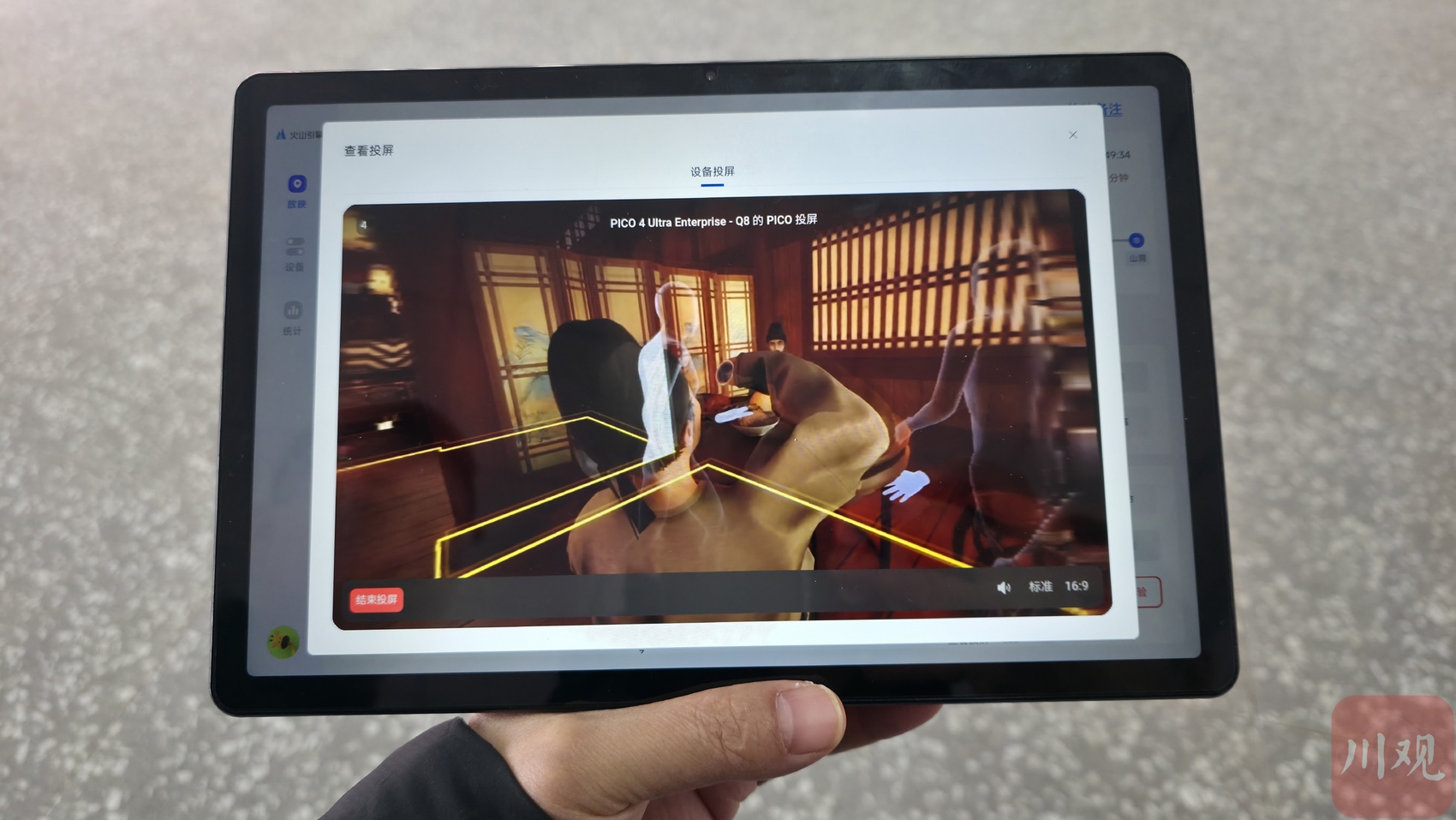 据了解,《国宝迷踪之寻迹大唐》以唐代盛世为历史背景,以海外回流文物为主题,构建一个关于文明与守护的沉浸式体验。其中设置了多件核心文物作为叙事支点,其中包括北魏石狮、唐刀、彩绘抱狗女立俑以及唐三彩镇墓兽。“从现代穿越到古代,寻宝的过程中与文物近距离接触,非常震撼。”和同学们一道经过半小时沉浸式体验后,向荣中学学生鲁王美才意犹未尽地摘下VR设备。