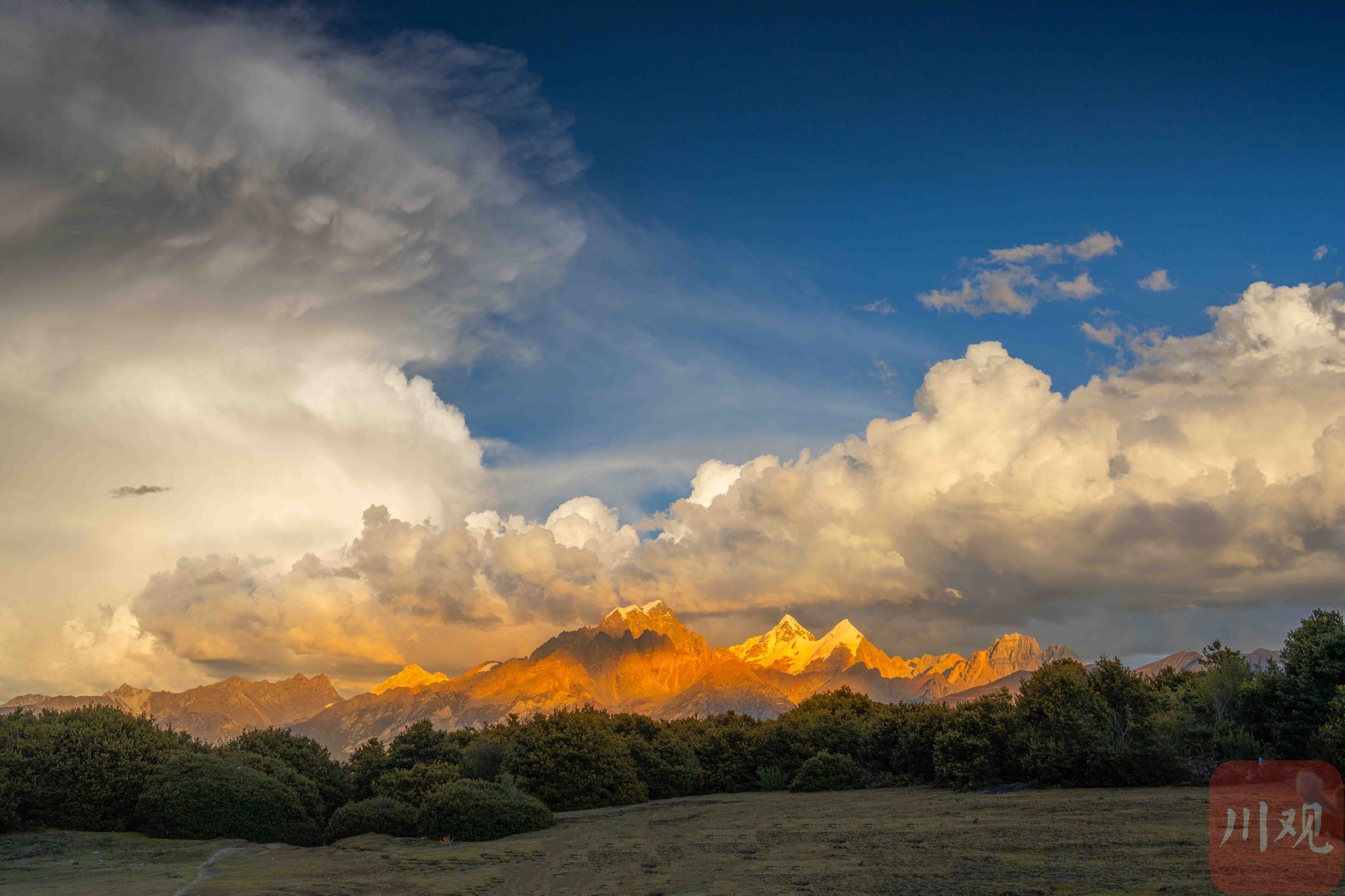 夕阳下的巴塘境内最高峰党吉曾然神山被霞光镀成金红,流云翻涌,更显威武壮阔。