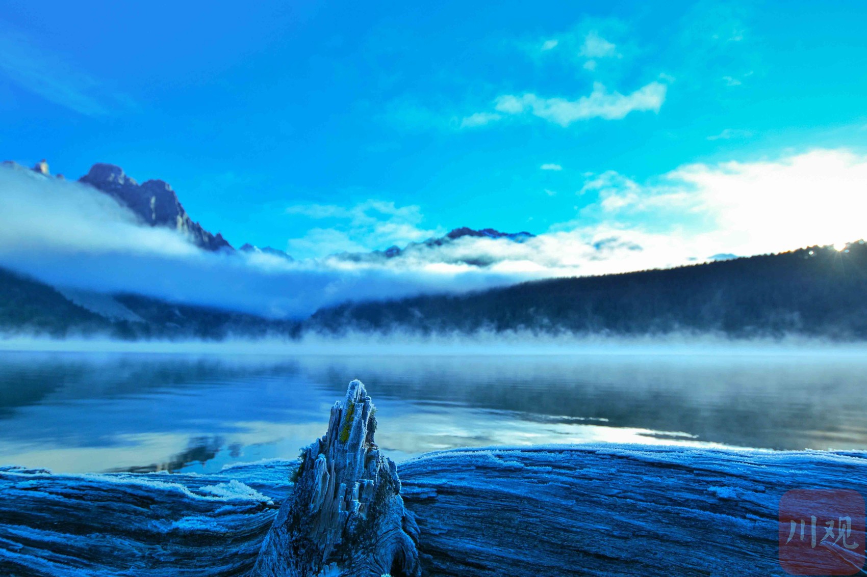 甘孜州巴塘县,高原海子揽尽整片云天,秋日草甸的暖黄与山石的冷冽相映成趣。