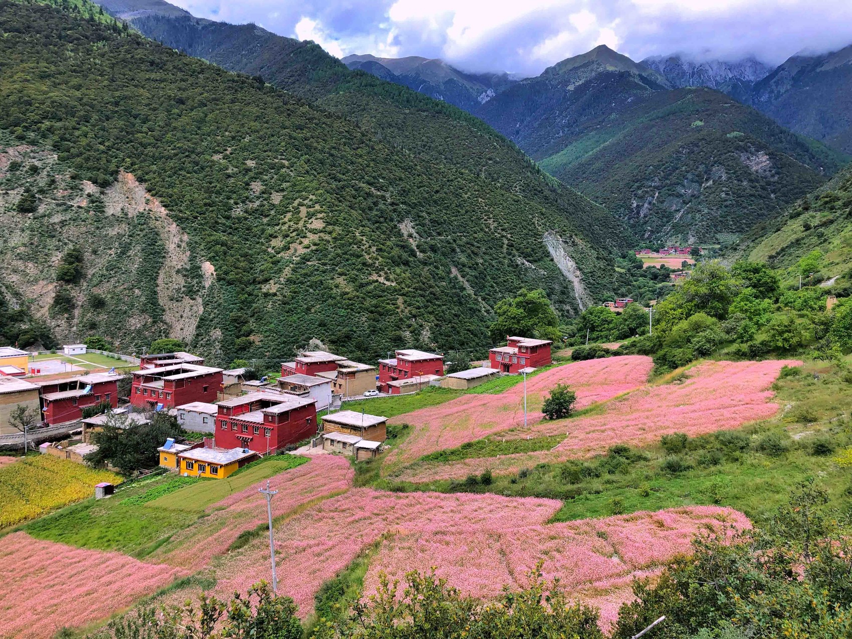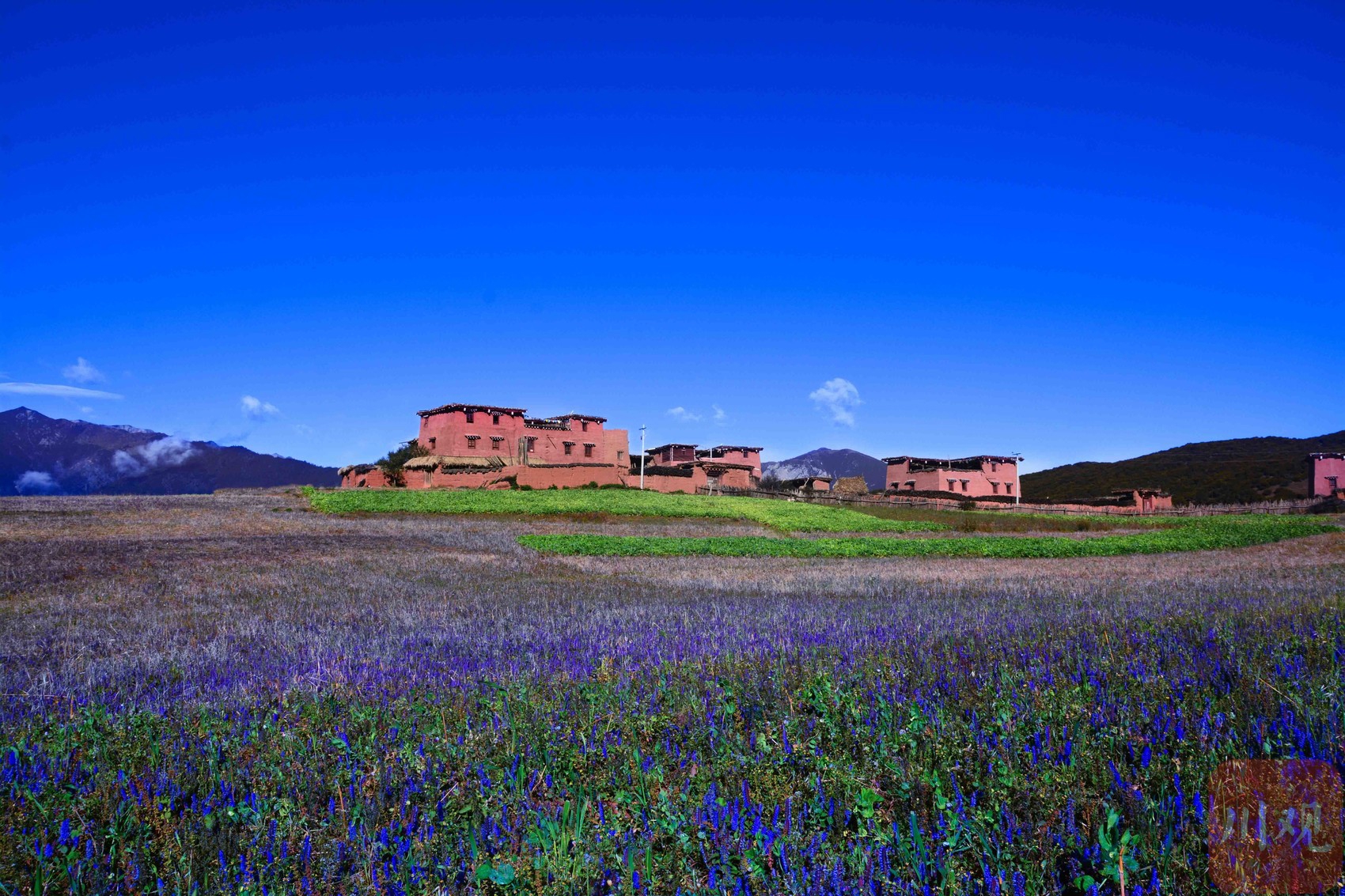 甘孜州巴塘县夏邛镇,传统红藏房与遍野紫穗相映成趣。
