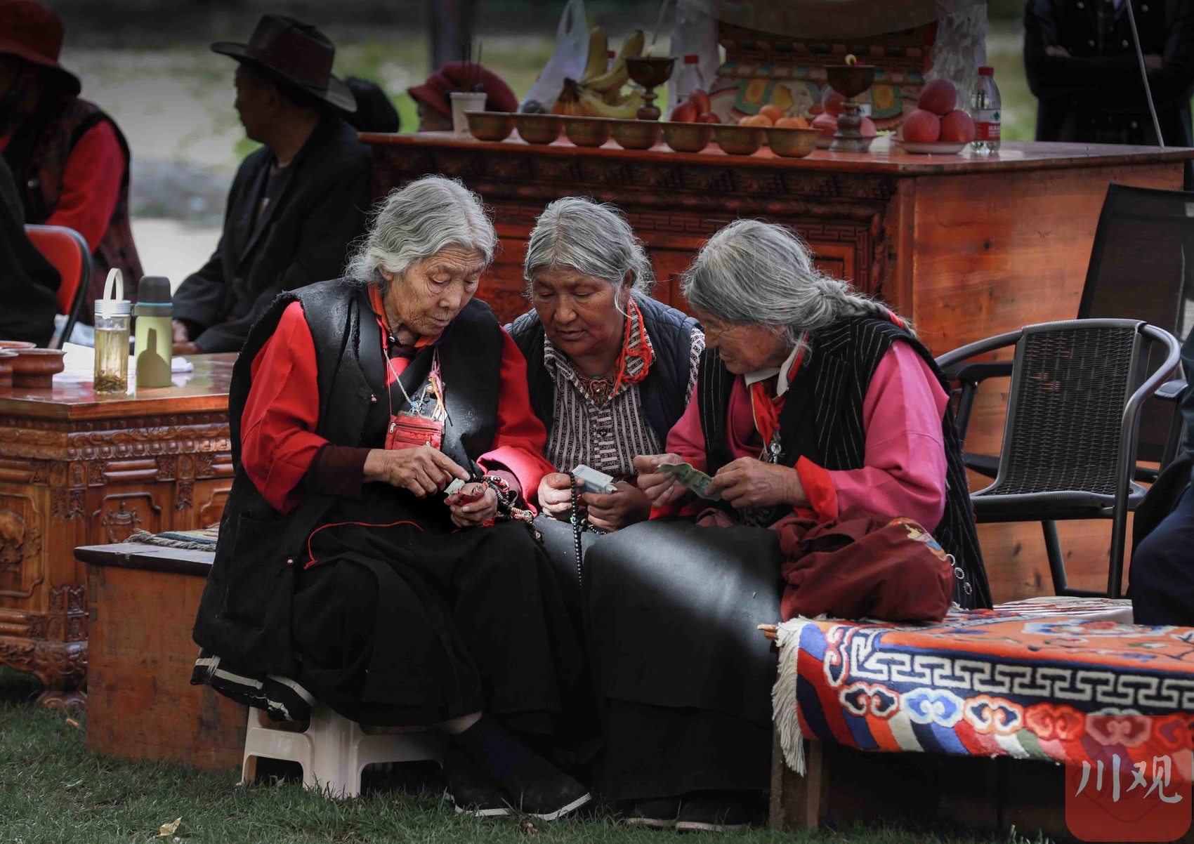 甘孜州巴塘县央勒节上,三位白发太婆商议打赏喜爱的藏戏演员。