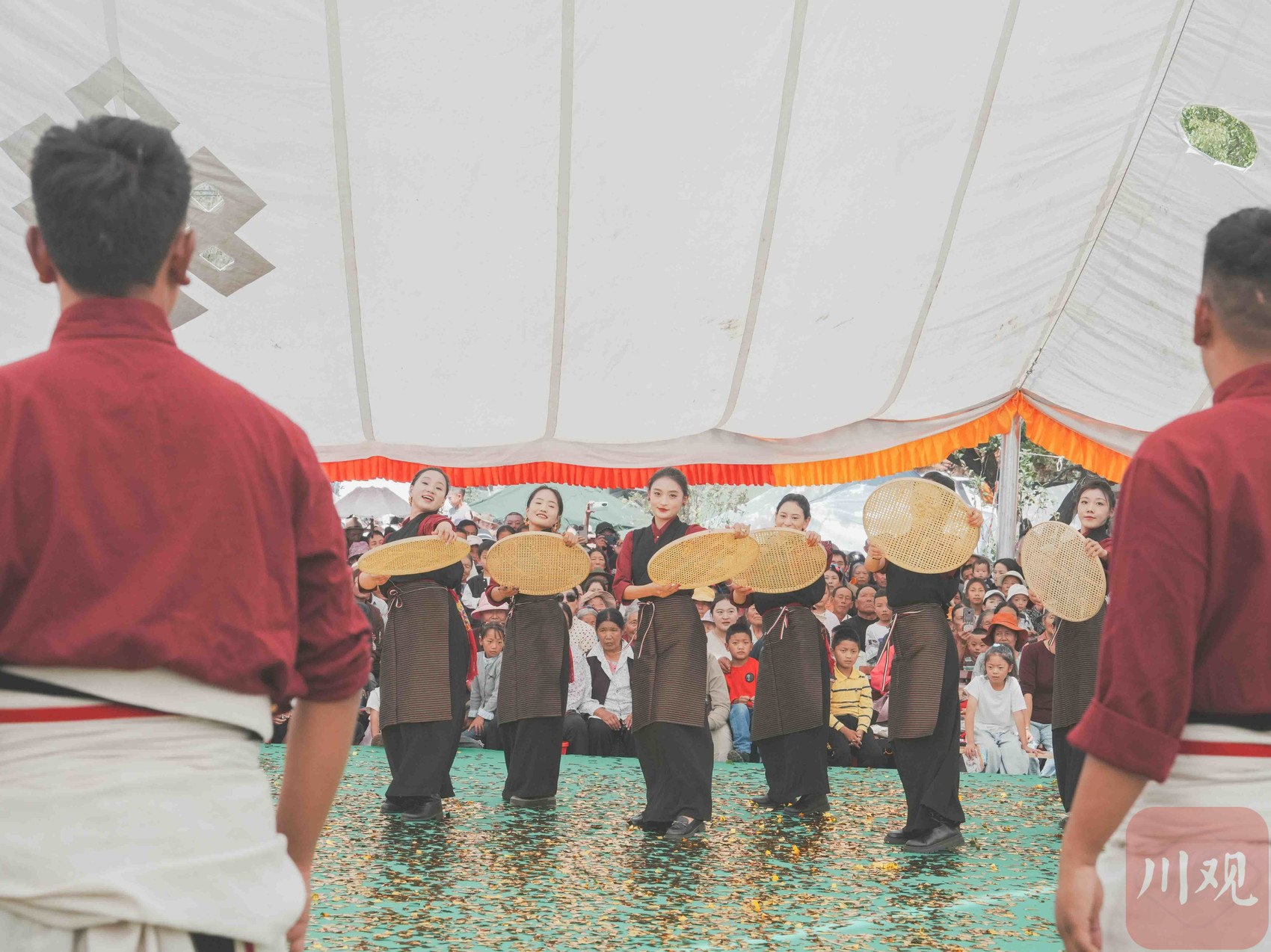甘孜州巴塘县夏邛镇龙王塘,一年一度的央勒节开幕式上,民俗歌舞燃动现场,群众喜迎丰收。