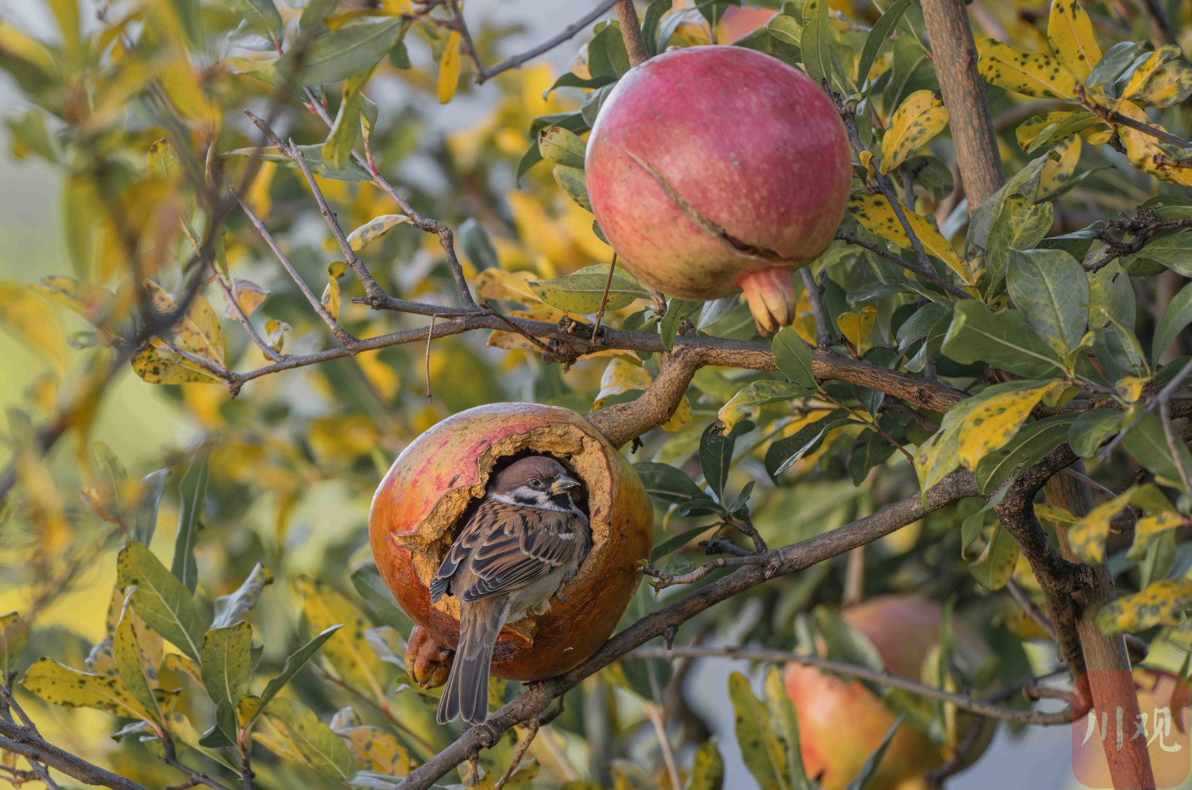 金沙江河谷地带的酸石榴,是当地有名的中藏药材,小麻雀将熟透的酸石榴变成自己的临时巢穴。