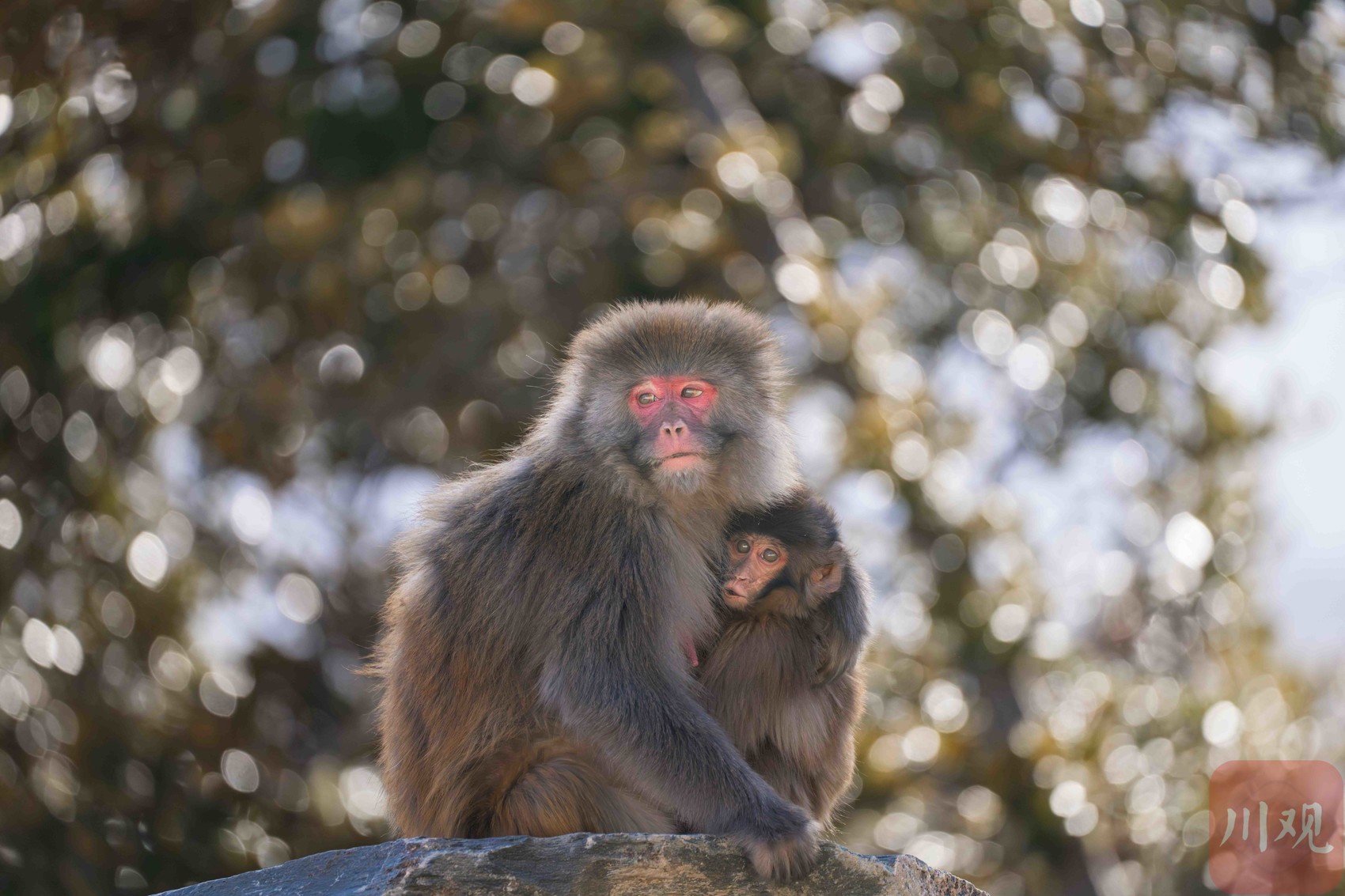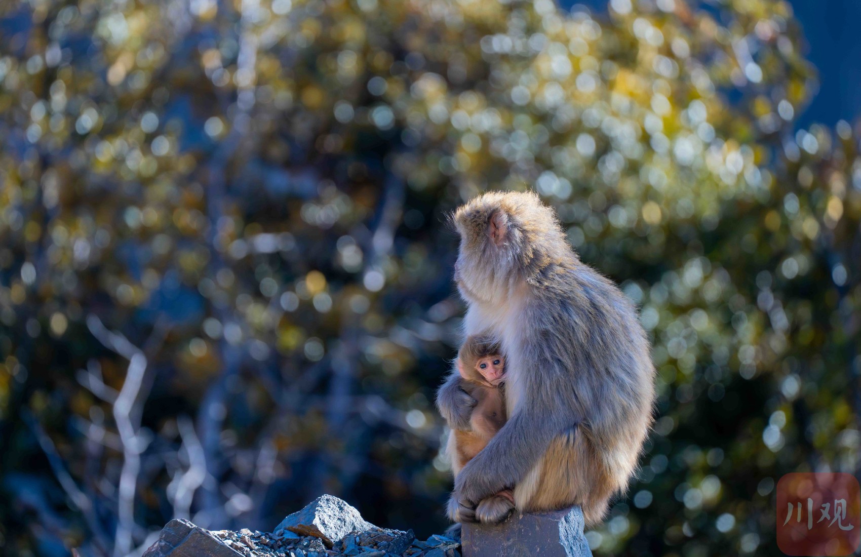秋日暖阳下的甘孜州巴塘县,猕猴母子相互依偎,山野间的温情令人动容。