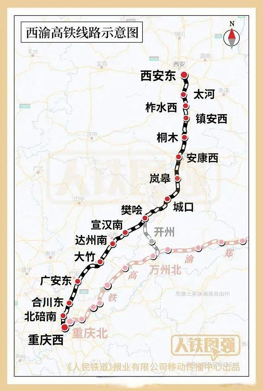 西渝高铁建成通车后,将与已建成运营的成都至重庆高铁、郑州至重庆高铁和在建的重庆至昆明高铁、西安至延安高铁、西安至十堰高铁等多条线路连通,推动中西部地区路网结构进一步完善,从西安至重庆的铁路运行时间将从现在的6小时左右缩短至2.5小时左右。