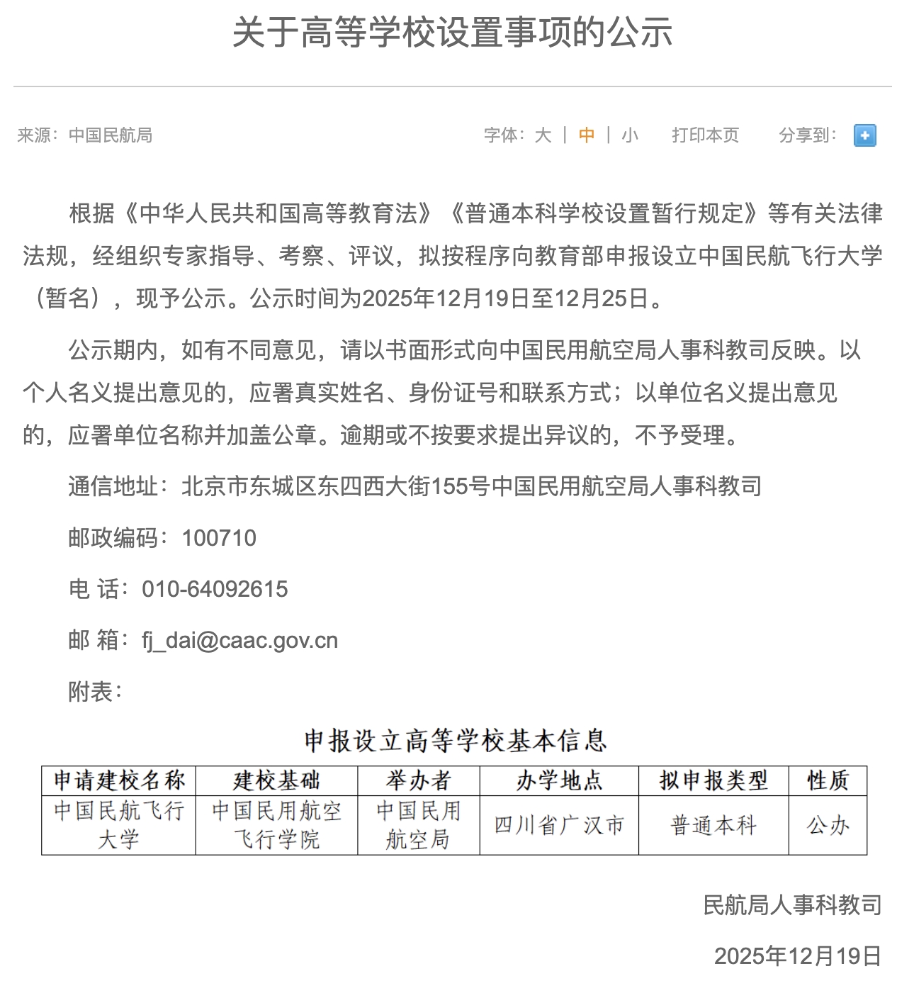 国内第一所“飞行大学”真的要来了! 12月19日,中国民用航空局发布《关于高等学校设置事项的公示》,拟在中国民用航空飞行学院的基础上,按程序向教育部申报设立中国民航飞行大学(暂名)。