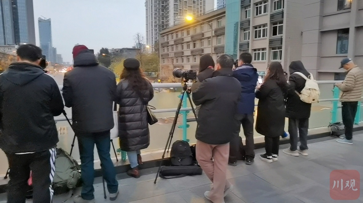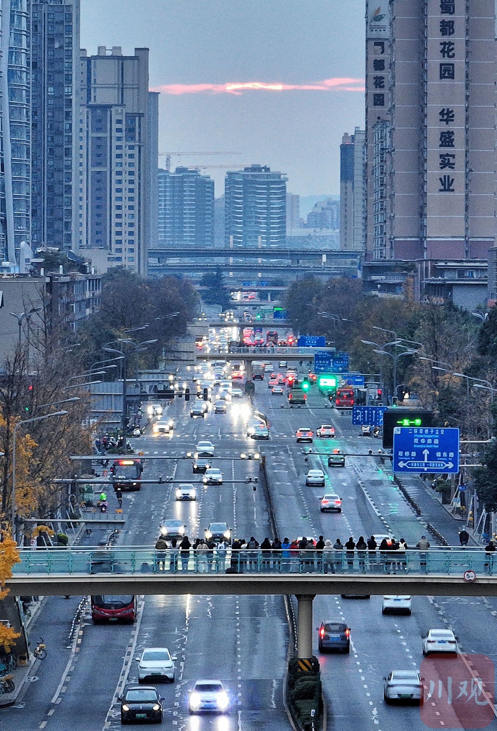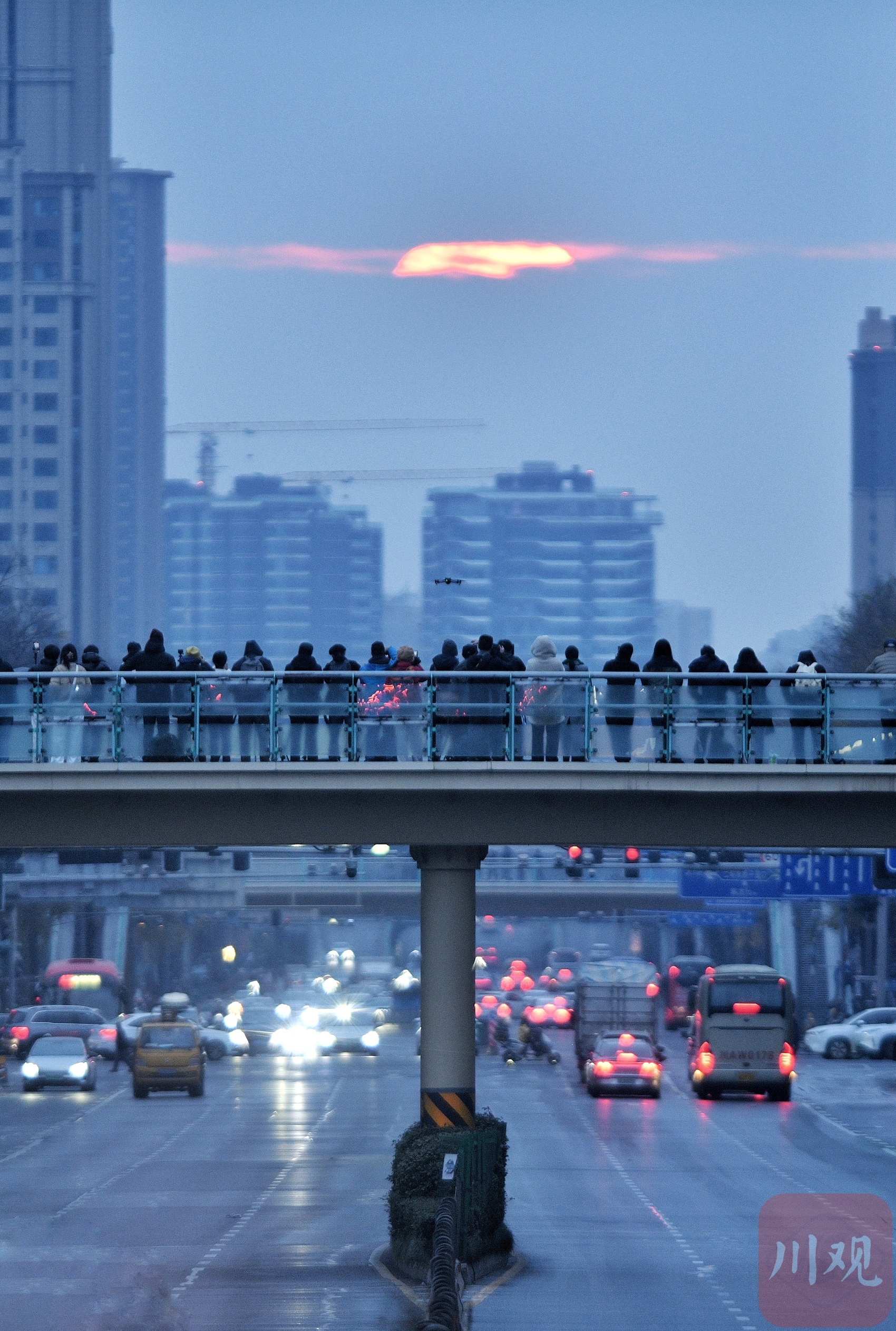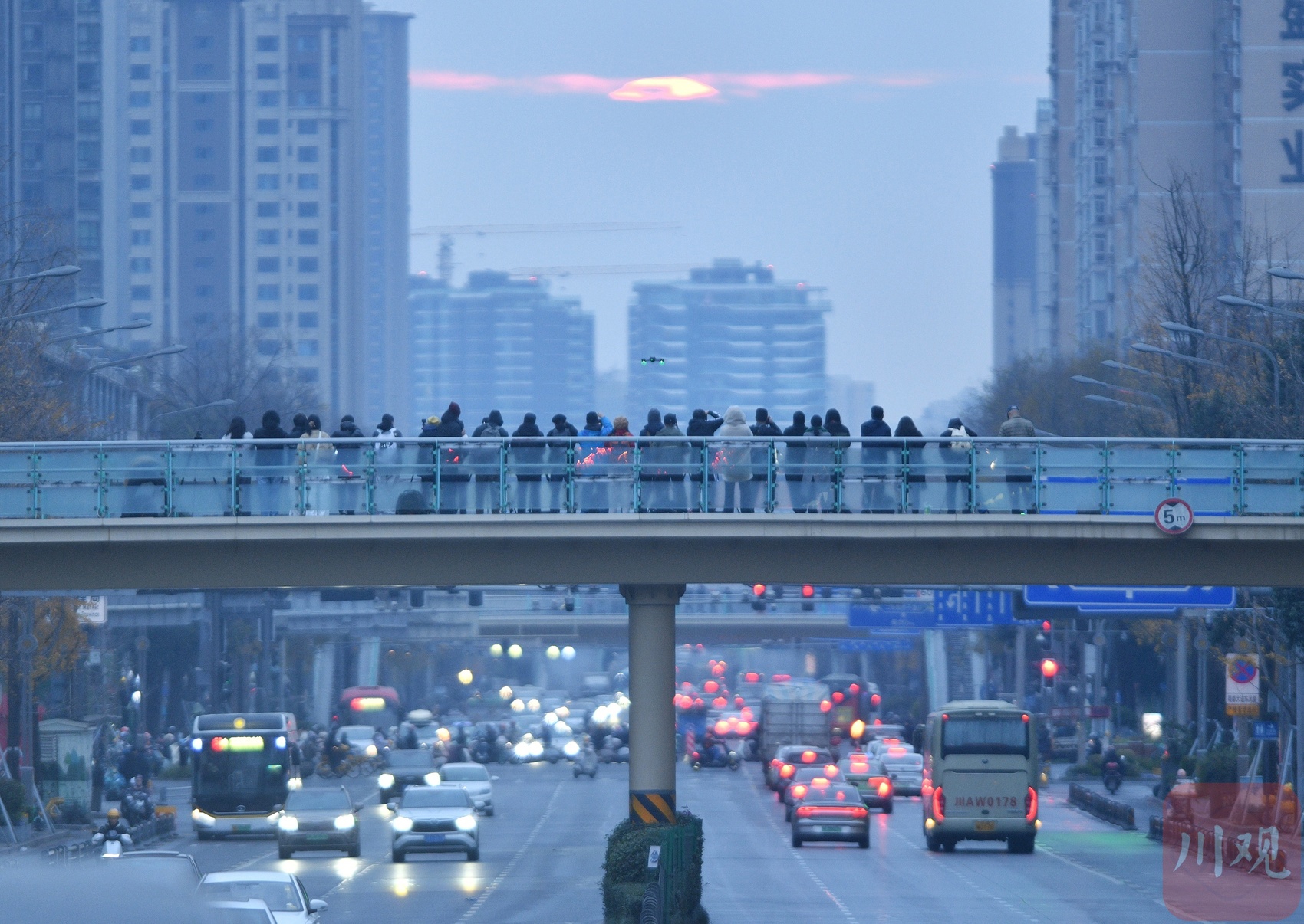 12月21日冬至清晨,成都市蜀都大道沿线的春熙路、东风路、水碾河等人行天桥上,聚集了许多等候拍摄“冬至悬日”的摄影爱好者。当日的天气预报显示,市区观霞日出的概率高达80%,不少人满怀期待,早早到场。