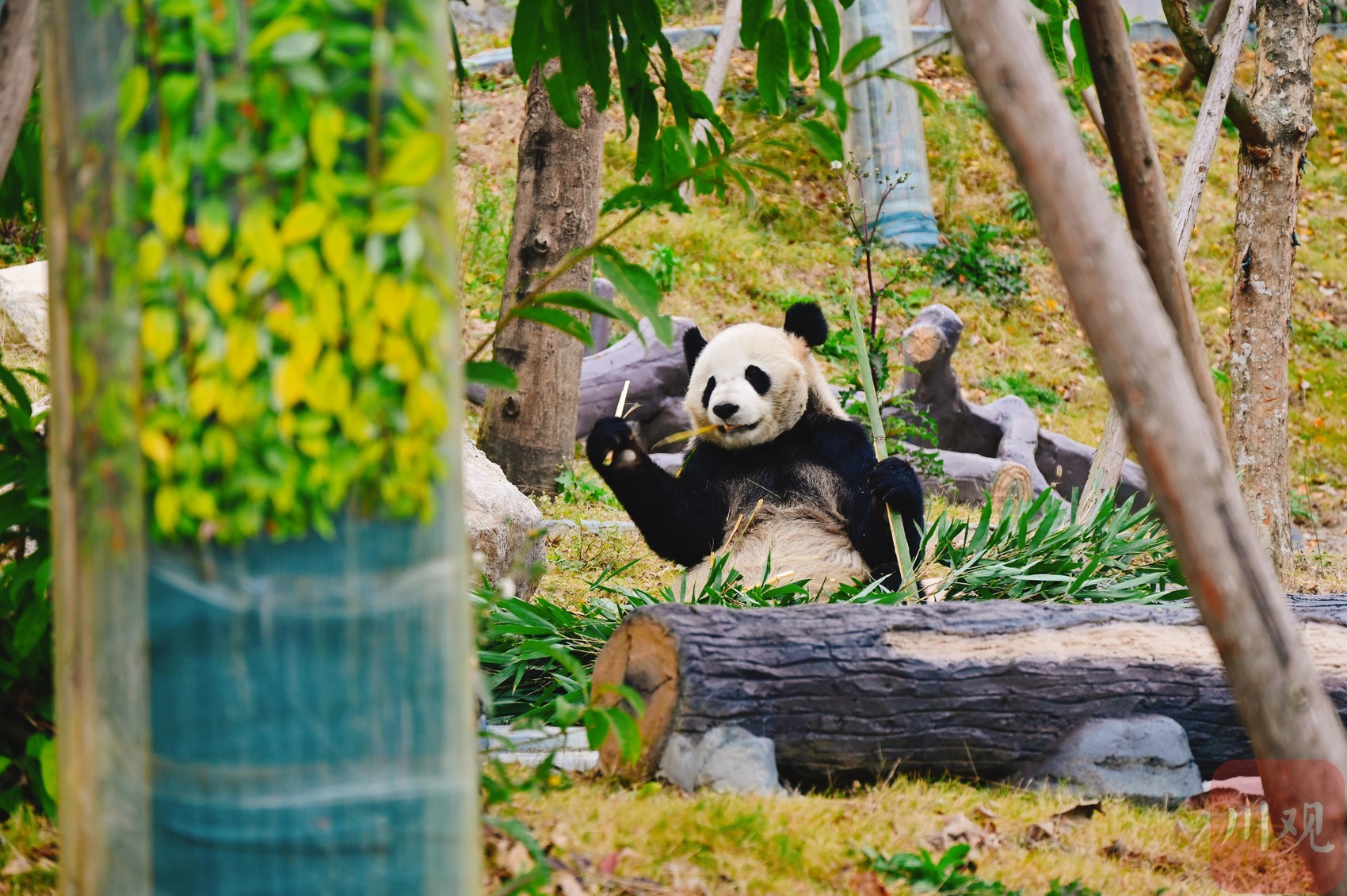 大熊猫在园区内吃竹笋。