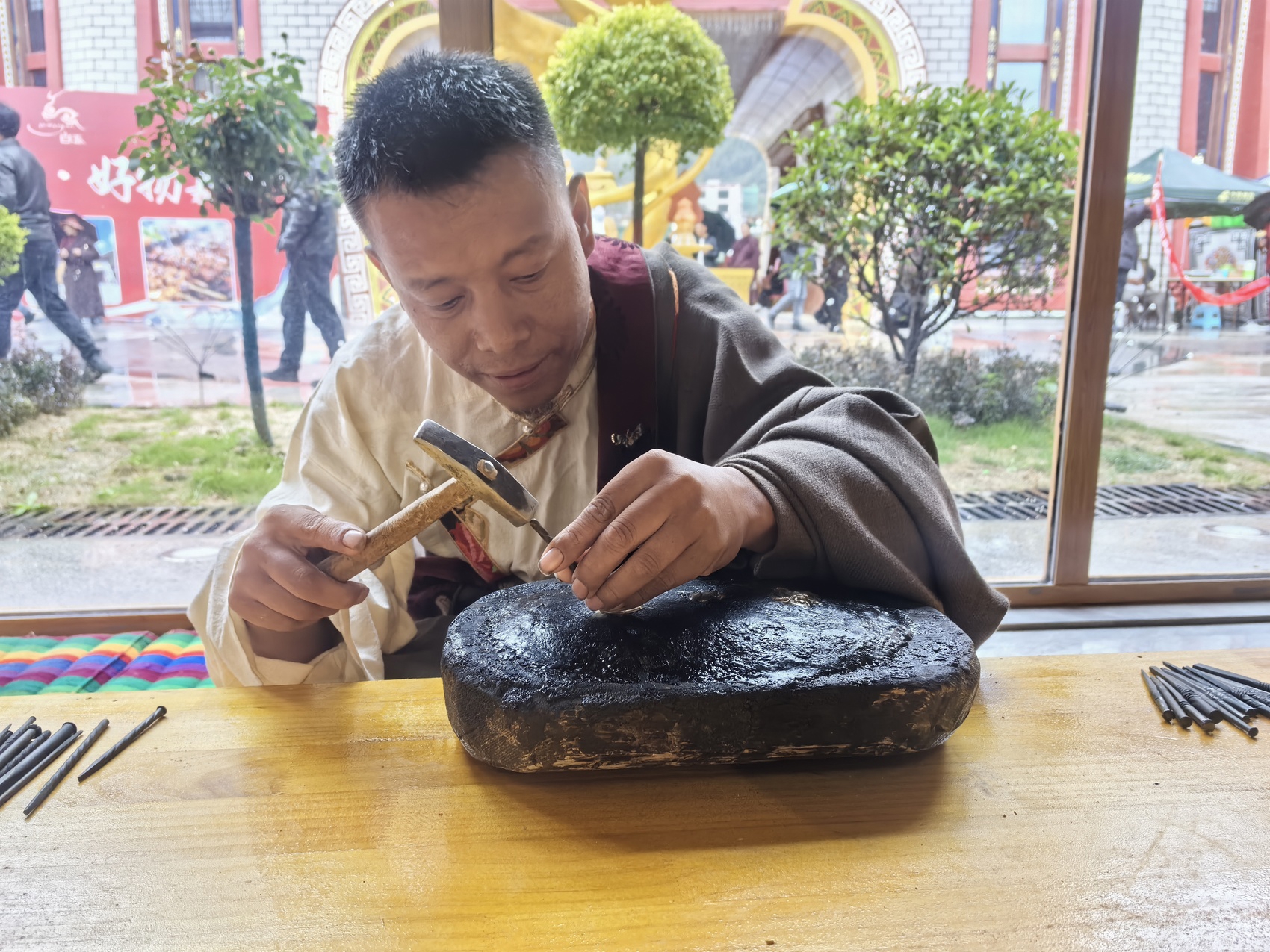 根秋单贞的产品包含藏刀、传统饰品等,消费群体主要是周边和青海、甘肃等地的群众。此前他把工坊设在河坡镇普马村自己家里,离县城有40多公里,车程近1小时,“离城区太远了,销路打不开,发快递也不方便。”正发愁的时候,听说白玉县城里建起河坡民族手工艺文旅体融合园区,入驻商户能享受租金减免,他便把工坊搬了进来。