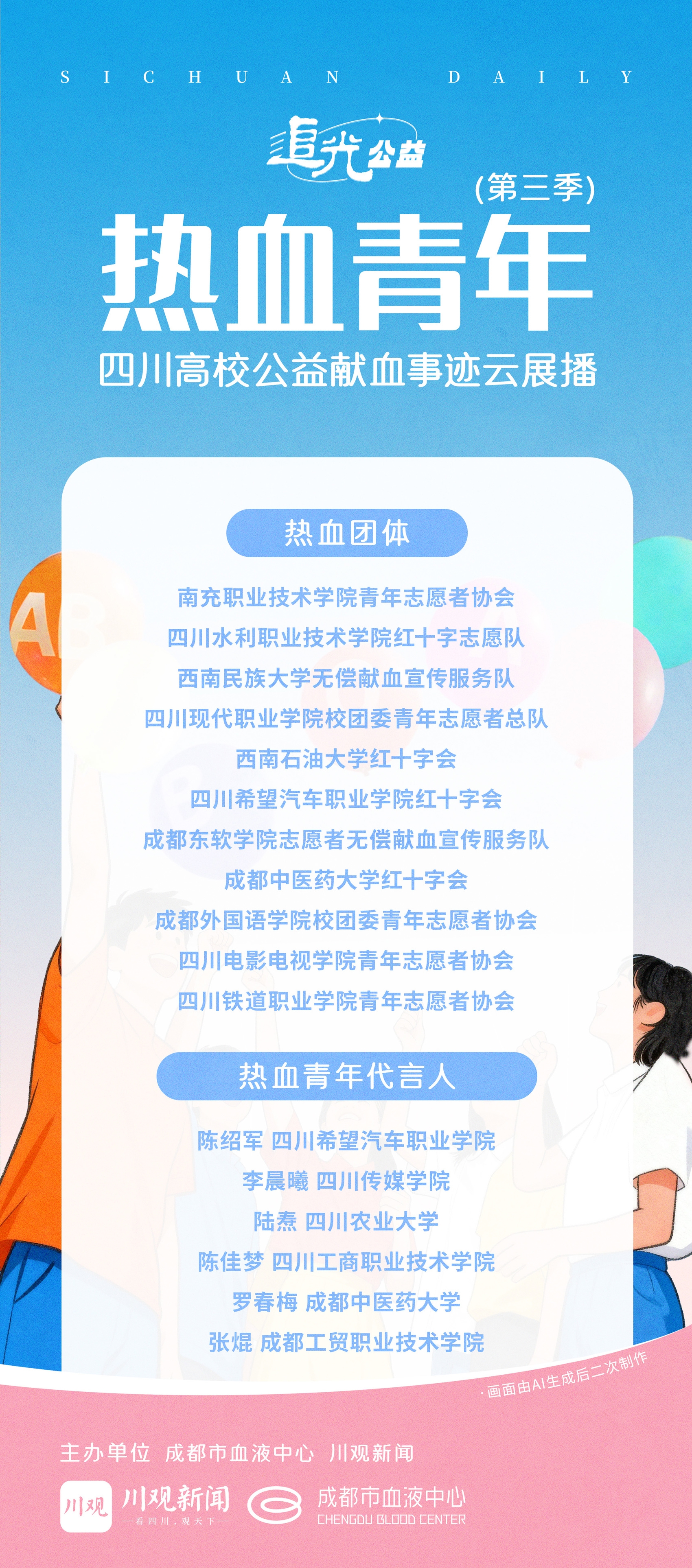 他的故事,是第三季“四川高校公益献血事迹云展播”活动中,上百个青春故事里的一个切片。活动由成都市血液中心和川观新闻联合推出,十天展播,吸引超百万人次关注。最终,11支高校热血队伍和6位“热血青年代言人”从无数热血故事中浮现。