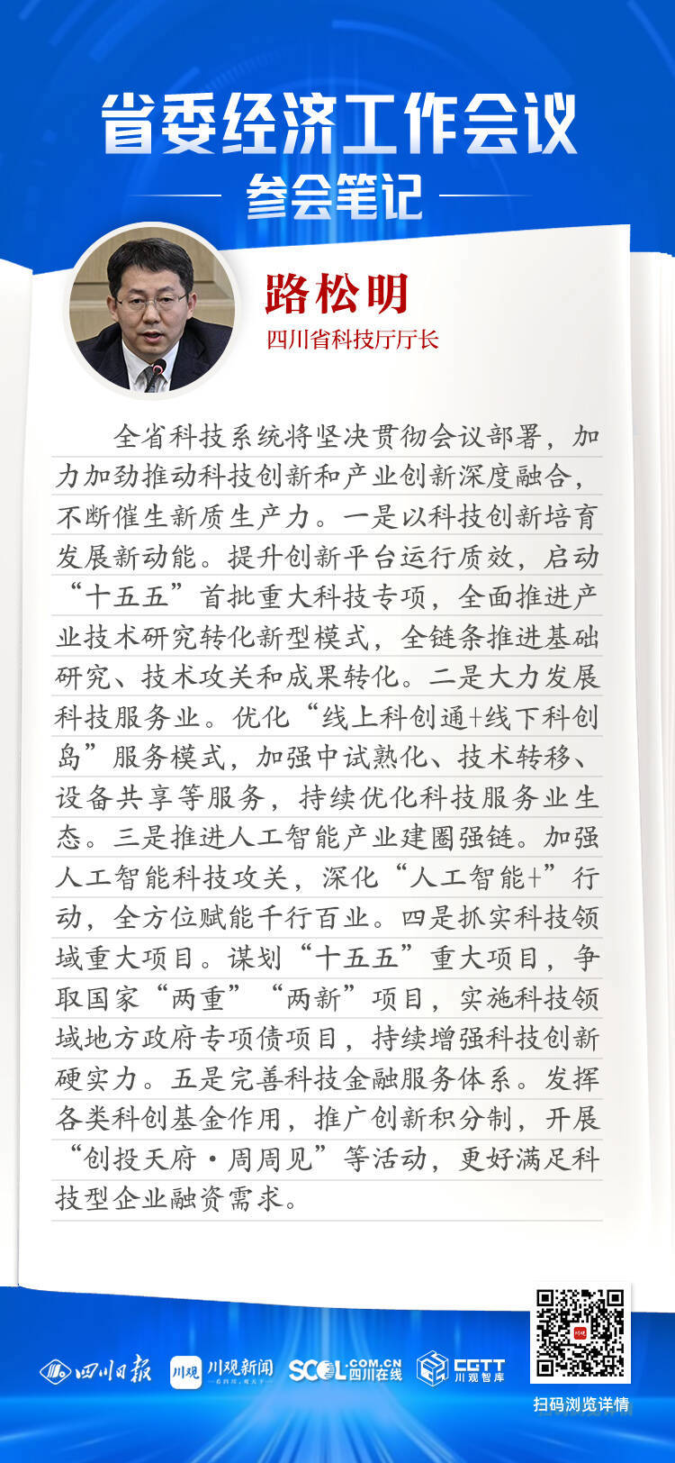 省委经济工作会议聚焦实现四川现代化“十五五”良好开局,系统部署了推动经济高质量发展的思路举措和重点任务,列出了2026年经济工作的任务书和路线图。全省科技系统将坚决贯彻落实会议决策部署,加力加劲推动科技创新和产业创新融合发展,不断催生新质生产力,努力为实现“十五五”良好开局贡献更多力量。