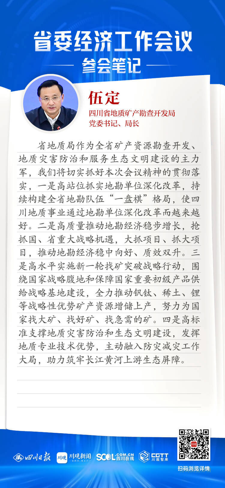 省地质局作为全省矿产资源勘查开发、地质灾害防治和服务生态文明建设的主力军,我们将切实抓好本次会议精神的贯彻落实,一是高站位抓实地勘单位深化改革,持续构建全省地勘队伍“一盘棋”格局,使四川地质事业通过地勘单位深化改革而越来越好。二是高质量推动地勘经济稳步增长,抢抓国、省重大战略机遇,大抓项目、抓大项目,推动地勘经济稳中向好、质效双升。三是高水平实施新一轮找矿突破战略行动,围绕国家战略腹地和保障国家重要初级产品供给战略基地建设,全力推动钒钛、稀土、锂等战略性优势矿产资源增储上产,努力为国家找大矿、找好矿、找急需的矿。四是高标准支撑地质灾害防治和生态文明建设,发挥地质专业技术优势,主动融入防灾减灾工作大局,助力筑牢长江黄河上游生态屏障。