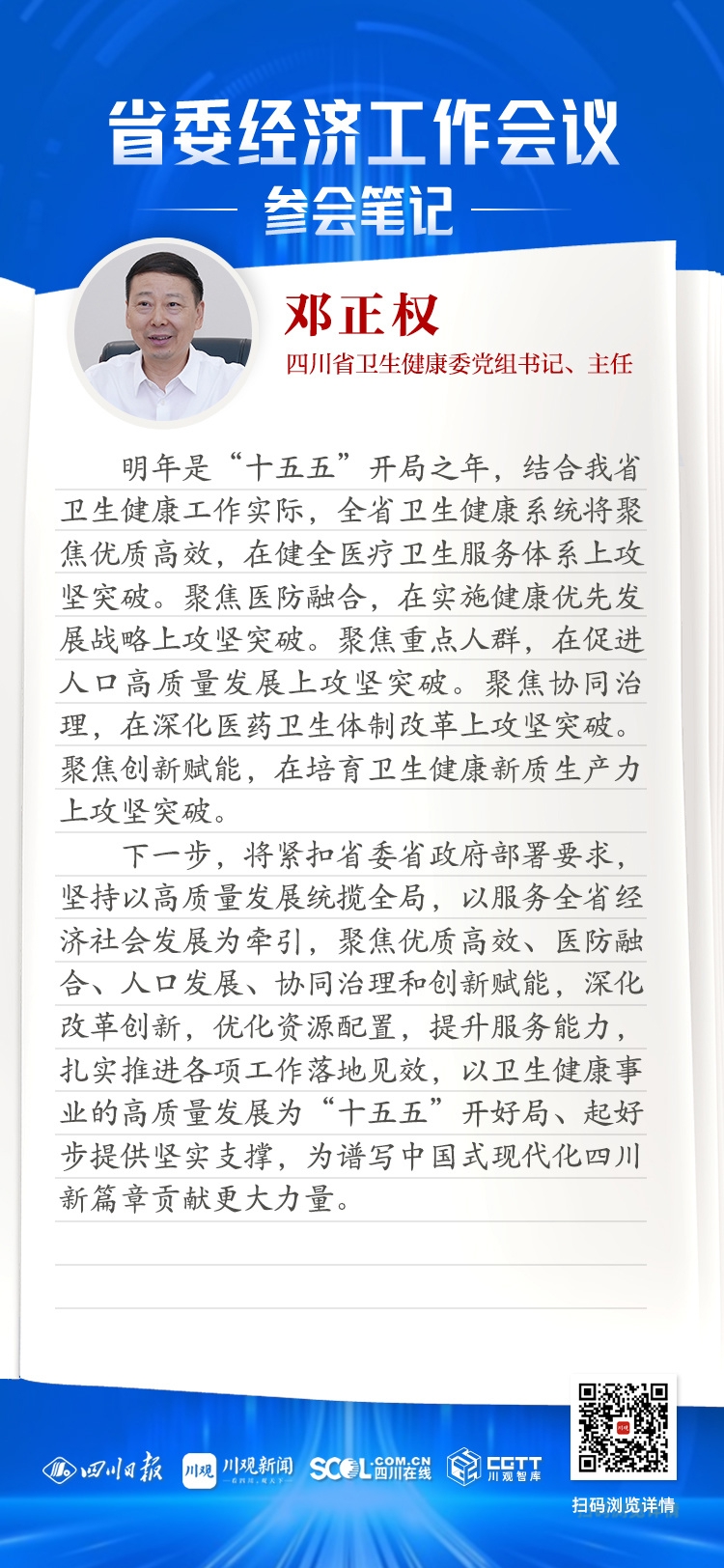 明年是“十五五”开局之年,结合我省卫生健康工作实际,全省卫生健康系统将聚焦优质高效,在健全医疗卫生服务体系上攻坚突破,建立医疗卫生资源动态调整机制,推进优质医疗资源扩容下沉和区域均衡布局;聚焦医防融合,在实施健康优先发展战略上攻坚突破,到2030年,人均预期寿命达80岁左右;聚焦重点人群,在促进人口高质量发展上攻坚突破,强化生育和育幼服务支持,研究制定生育休假成本分担政策,加快构建以托育综合服务中心为枢纽的“1+N”托育服务体系;聚焦协同治理,在深化医药卫生体制改革上攻坚突破,争取更多国家级试点示范落地四川;聚焦创新赋能,在培育卫生健康新质生产力上攻坚突破,实施医防管交叉复合型战略人才培养工程,推广远程医疗、医学人工智能辅助诊断,2030年实现高精尖医疗技术和基层医疗服务水平全国一流、西部领先。