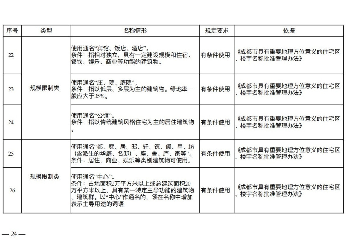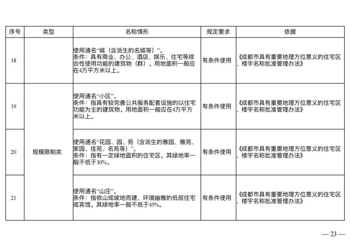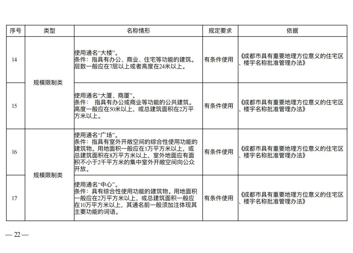 避免重名同音:规定在市辖区、市政府确定的特定区域或其他县级行政区划范围内,住宅区、楼宇名称不得重名、同音,并禁止通过简单增减“大”“新”“成都”等字词制造名称混淆。