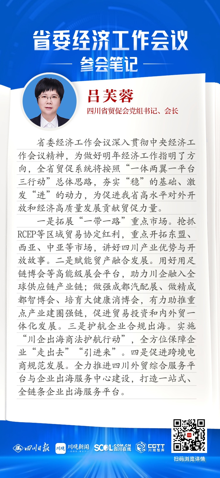 省委经济工作会议深入贯彻中央经济工作会议精神,为做好明年经济工作指明了方向,全省贸促系统将按照“一体两翼一平台三行动”总体思路,夯实“稳”的基础、激发“进”的动力,为促进我省高水平对外开放和经济高质量发展贡献贸促力量。