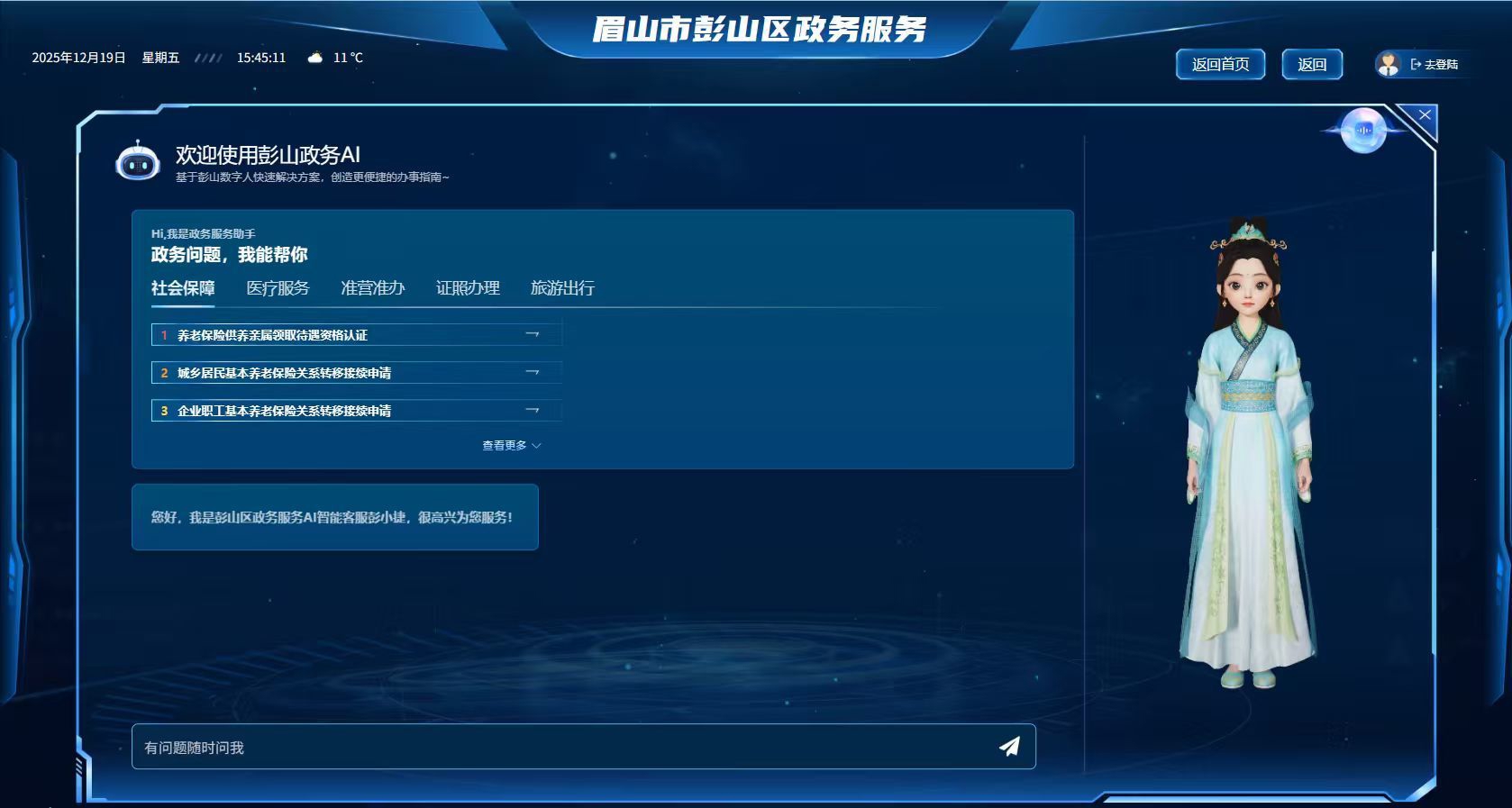 这位24小时在岗、秒级响应的“明白人”,是眉山市首个基于DeepSeek大模型开发的AI数智人“彭小捷”。今年2月底上线以来,这位特殊的“政务员”已推动实现智能客服使用率同比提升400%,服务事项退回重办件下降50%,群众跑动次数减少50%,让政务服务从“在线化”办理向“智能化”体验跨越。