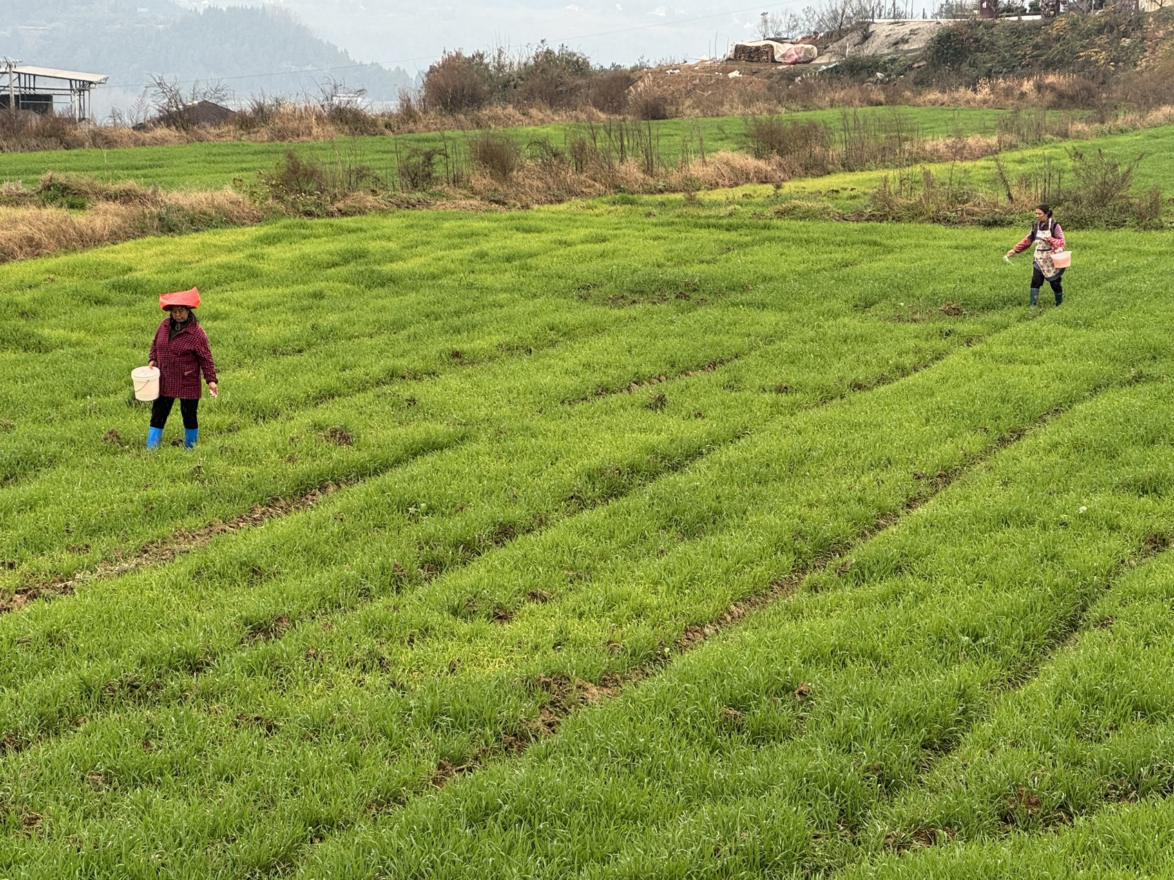 “要得!”应答后,村民何琼兰、刘菊英手提肥料,绕过长势好的绿麦苗,往田块边沿走去,追着“发育不良”的黄麦苗“投喂”。