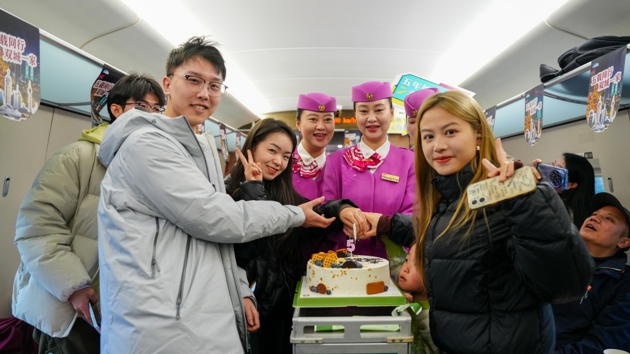 “成渝高铁公交化运营五周年快乐!”12月24日,成都东开往重庆西的G5753次列车车厢内响起阵阵欢歌,一块印有“成渝高铁公交化5周年”字样的主题蛋糕被缓缓推到旅客面前。