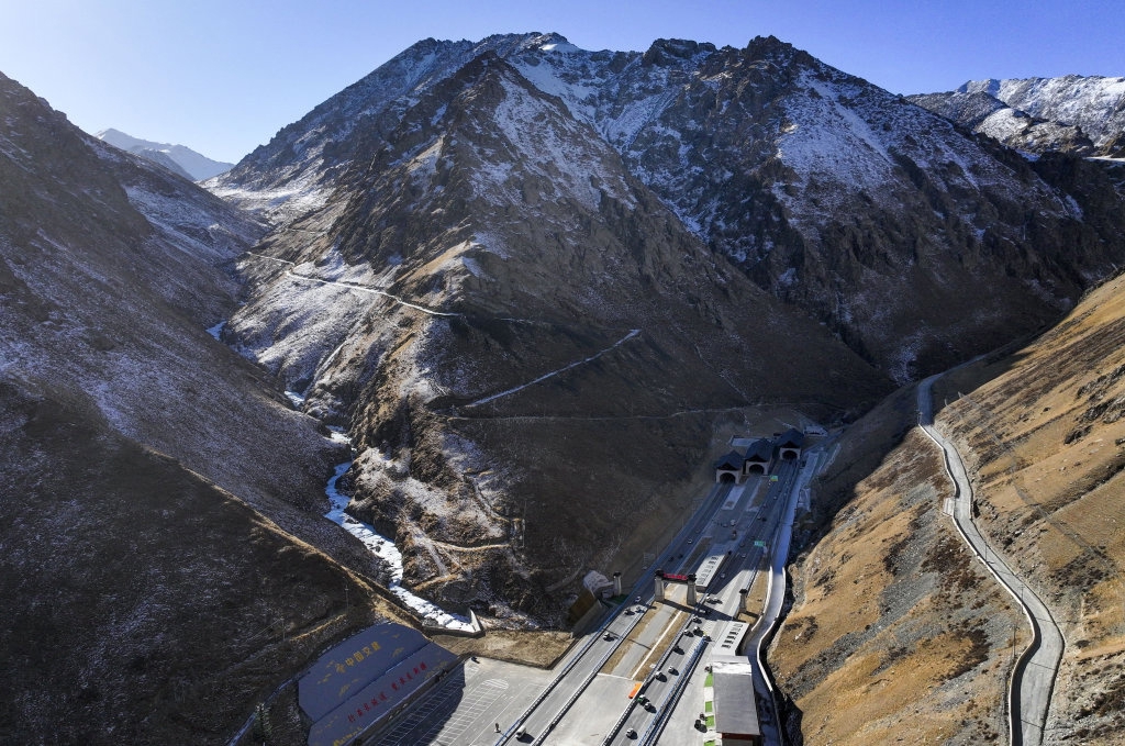 12月26日,车辆行驶在新疆乌尉高速公路天山胜利隧道入口端附近(无人机照片)。