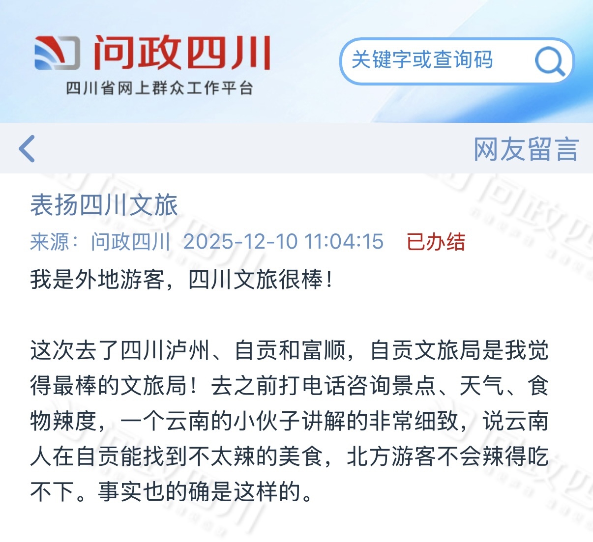 “电话上午打的,下午就改了,效率真高!”“希望狠狠表扬这些部门的工作人员!我对四川文旅的印象非常好!还会再来的!”日前,问政四川上一篇表扬信引关注,一位网友留言称要“表扬四川文旅”。这是为什么?