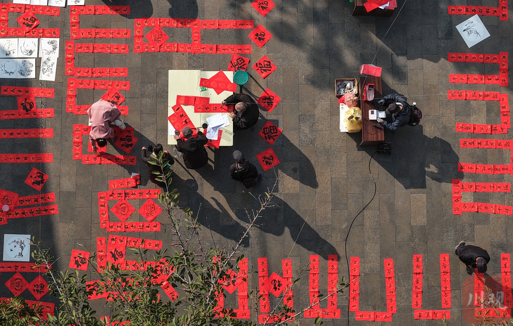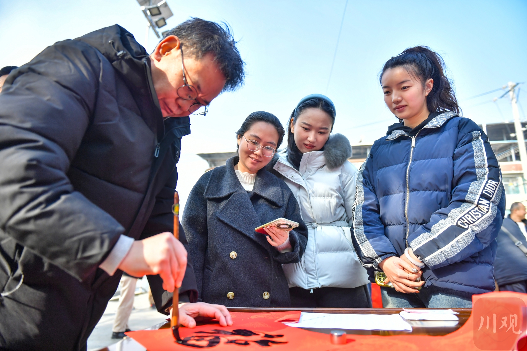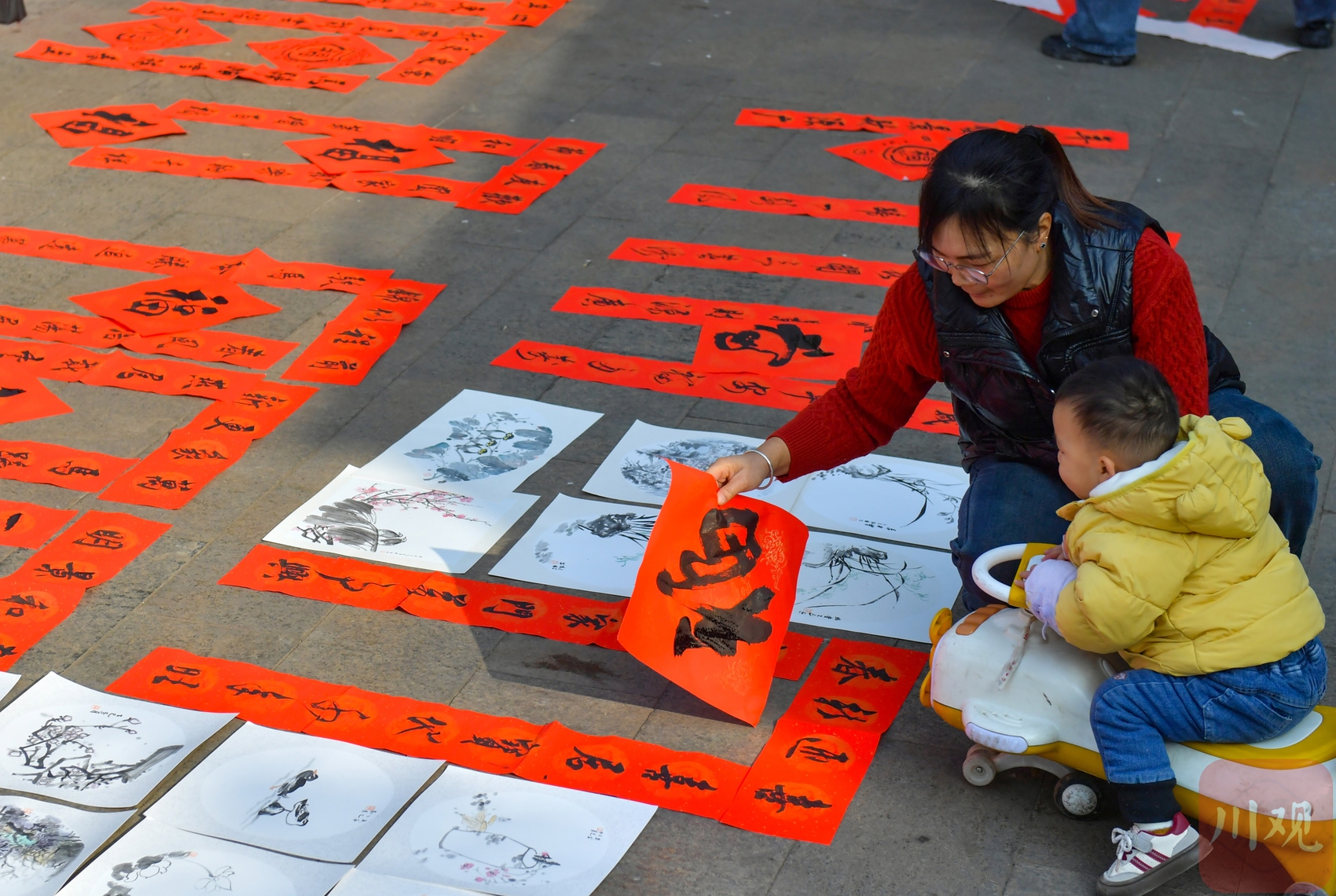 现场,一张张红纸铺展,喜庆的“福”字跃然纸上。春联既有传统佳句,也有贴合时代生活的原创联语。书画爱好者挥毫泼墨,一幅幅形神兼备的国画作品渐次呈现。拍摄区笑语不断,村民们的笑脸与全家福被现场打印、即刻送上。闻讯而来的居民围拢在桌边,有的静静观赏创作,有的精心挑选春联,有的请书画家量身创作作品,还有的排队等候拍照,场面温馨热闹。