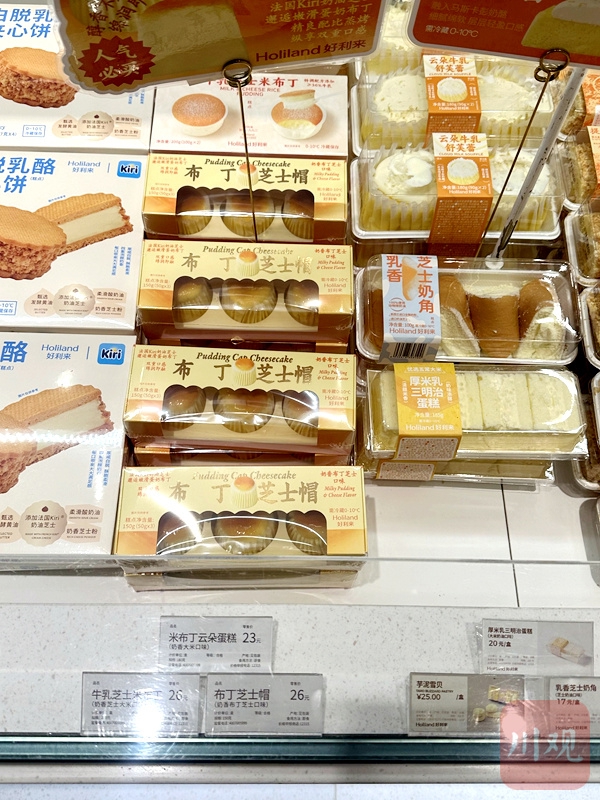12月30日,记者来到好利来清江西路店,货架上动物造型的萌趣面包、五彩星空般的创意馅料、各种潮流品牌的联名款……一个个面包精致亮眼,价格也“嗖嗖”攀升:150g的米布丁云朵蛋糕23元、150g的布丁芝士帽26元、联名款半熟芝士更是高达40元/盒。