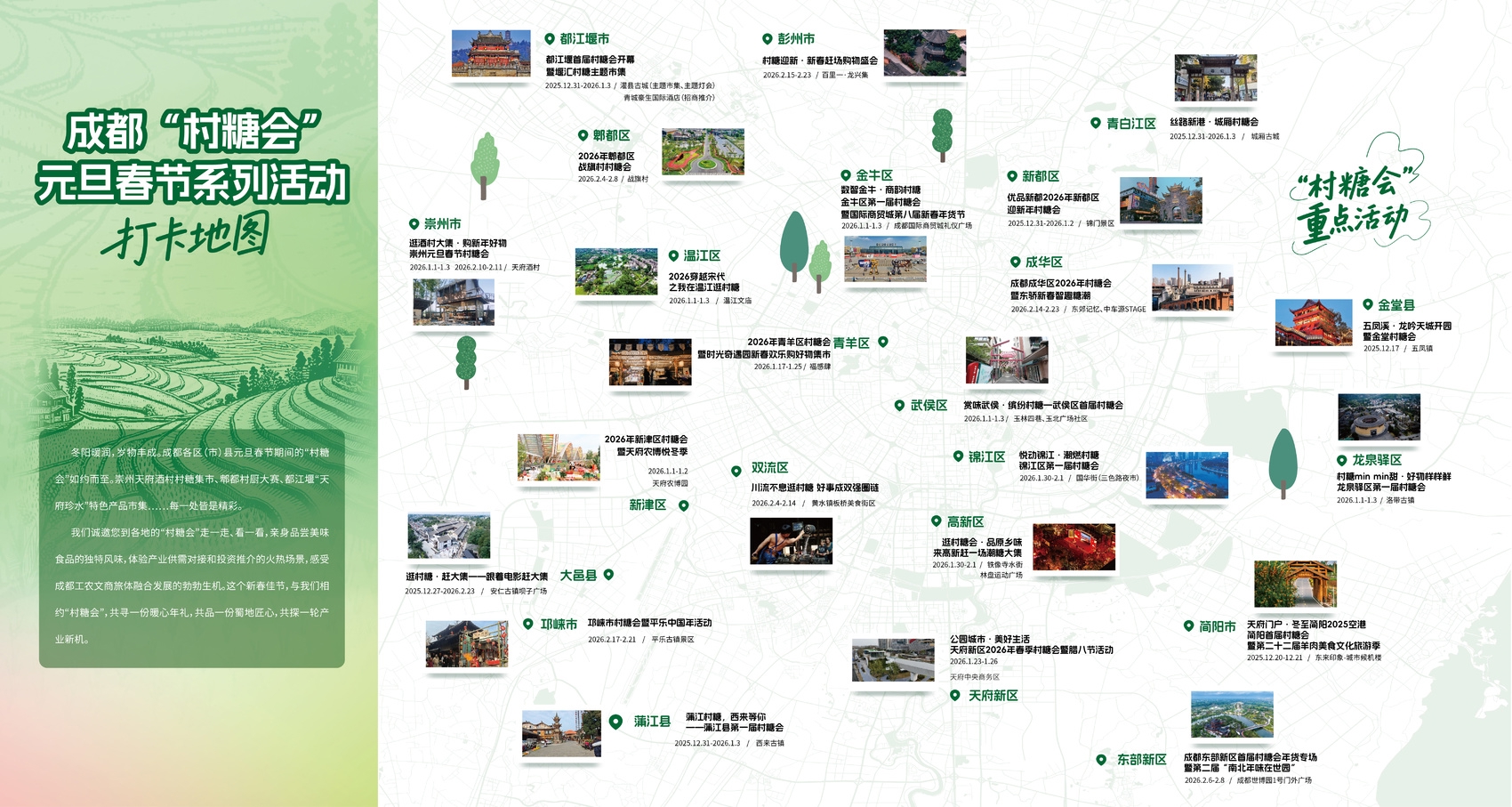 这颗“糖”绝不单调。从新都的嗨购香城,到郫都的村厨大赛,再到青白江的好物展销……元旦春节前后,70余场活动在成都23个区(市)县层层绽放。你可以穿越回宋代温江文庙逛集,也可以在玉林街巷赏味武侯,或是在洛带古镇看汉服巡游。它像是乡村版的“十二月市”,也像是一场场产品博览会、供需对接会、投资推介会。这颗“糖”,花样百出,总有一款对你的味。