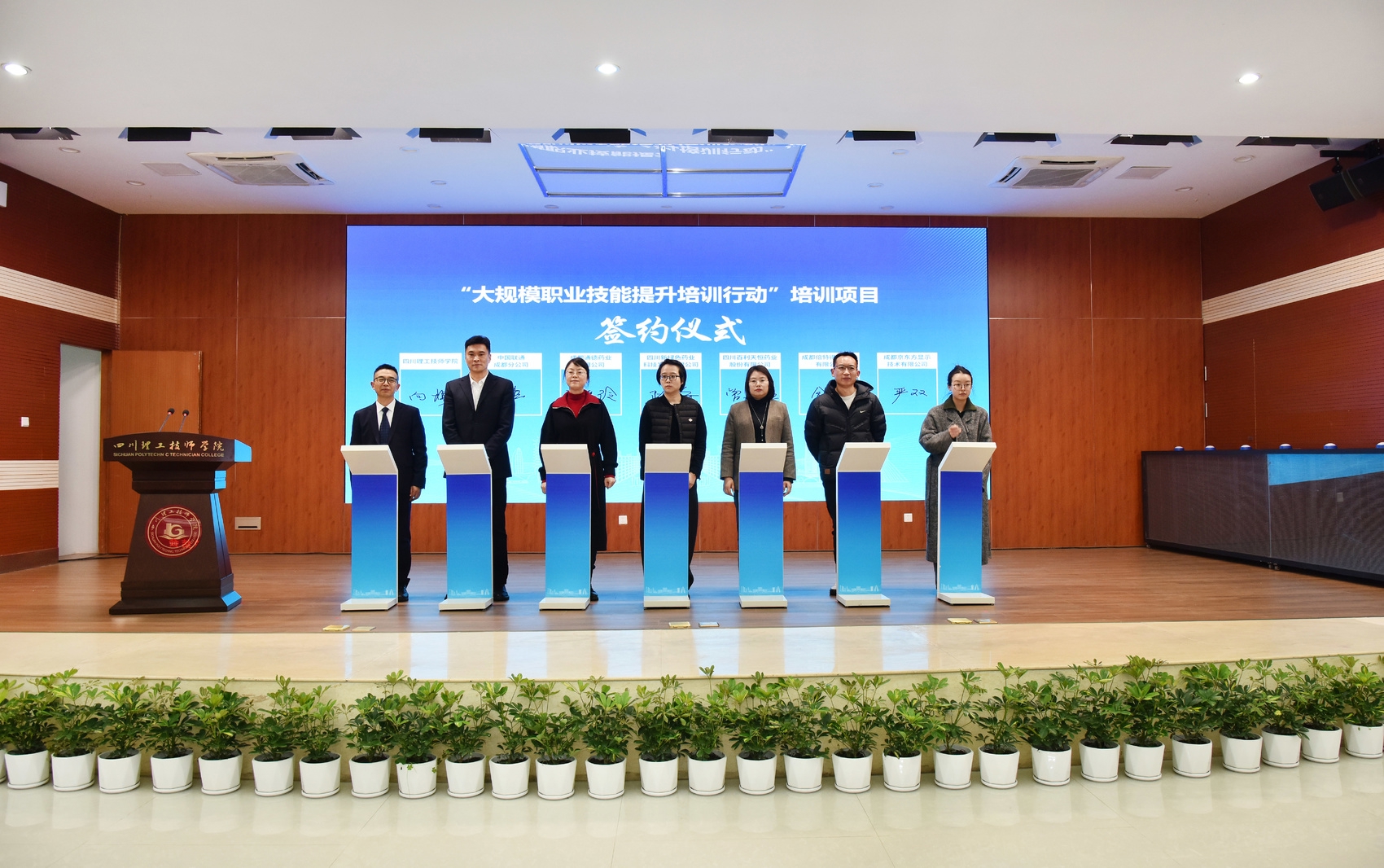 训练院能训练什么?活动现场公布了训练院首批重点培训项目,涵盖省本级示范培训、乡村振兴培训、区县品牌培训、企业新型学徒制培训、企业订单班五大类,包括工业机器人系统操作员、道地中药材种植、“鱼凫药康师”品牌培训等特色项目。现场还举行了校企合作签约,四川理工技师学院与通德药业、中国联通、百利天恒药业等六家重点企业签约,将在新型学徒制、订单培养培训等方面开展合作。