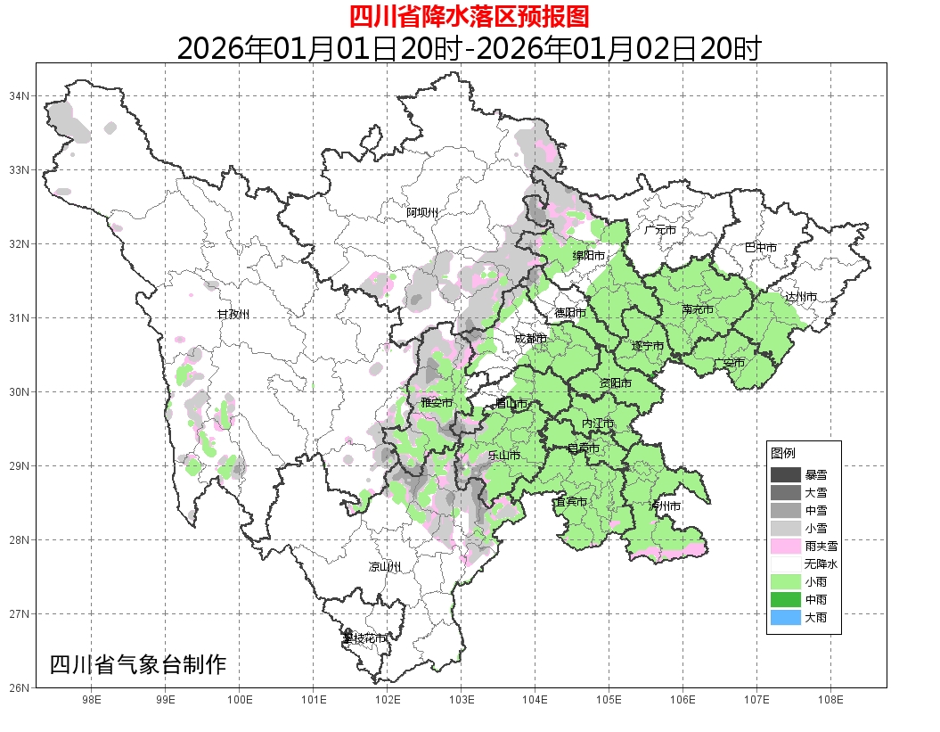 12月31日晚上到2026年元旦白天,盆地大部阴天,西南部、南部、中部及西北部沿山有小雨,高海拔山区有雨夹雪或小雪,局地中雪;甘孜、阿坝两州东部和凉山州东北部阴天间多云有分散阵雪或阵雨,川西高原和攀西地区的其余地方多云间晴。