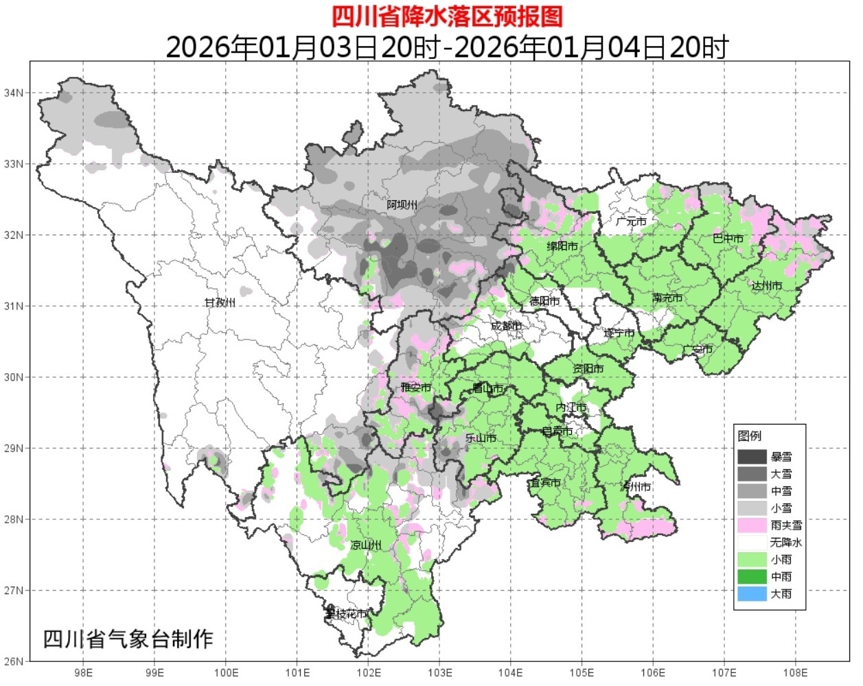 3日晚上到4日白天,盆地大部阴天有小雨,高海拔地区有雨夹雪或雪;阿坝州、甘孜州西北部东部和凉山州大部阴天间多云有阵雪或阵雨,局部有中到大雪,川西高原和攀西地区其余地方多云间晴。