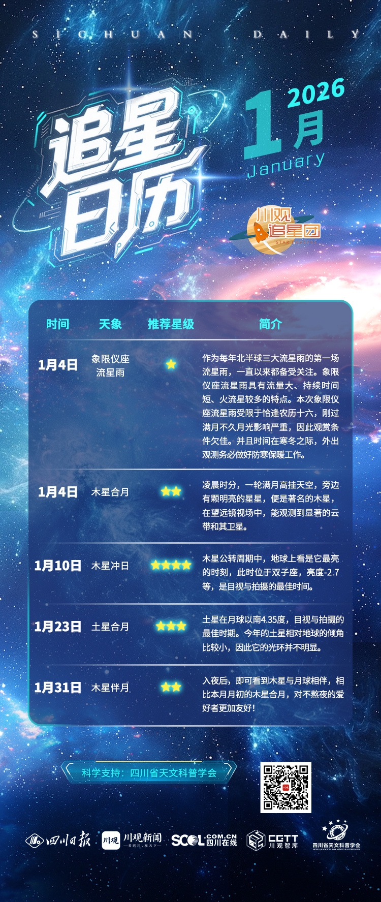 1月的星空热闹非凡,从流星划过的瞬间惊艳到行星与月球的持久浪漫,每一场天象都是宇宙的馈赠。不妨约上三五好友,在璀璨星河下,许下新一年的美好心愿,让2026年从仰望星空开始,满是温柔与惊喜。