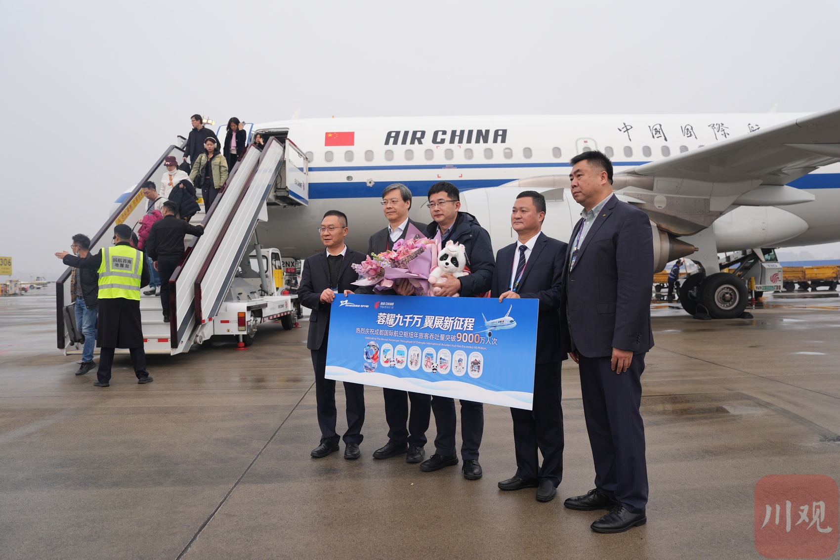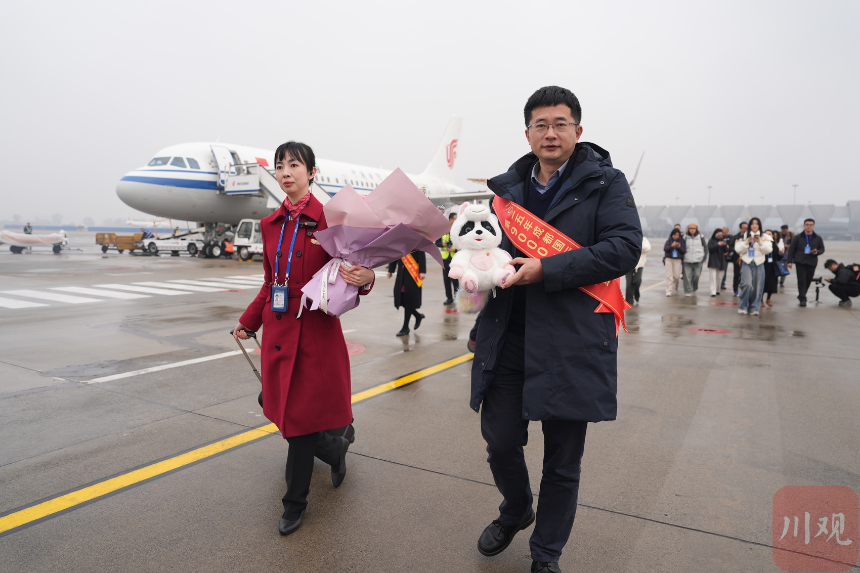 来自电子科技大学的科技工作者姜辉是第9000万名旅客, 他表示很荣幸能见证这一历史时刻,“成都航空的发展让四川和全国乃至世界的联通更顺畅,也让成都的教育和科研影响力更广。”
